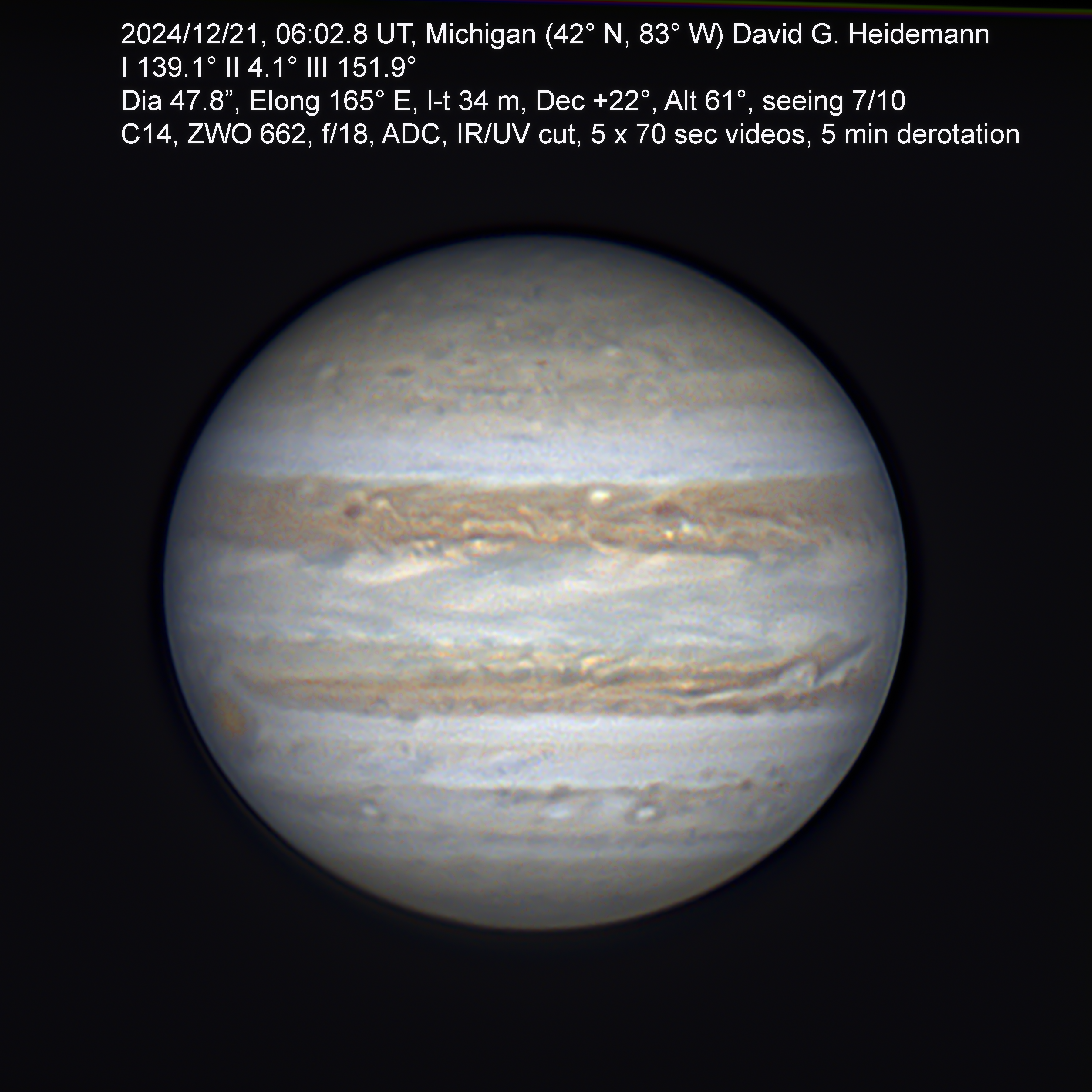 Jupiter from Detroit area, 5 x 70 second videos, altitude 61 degrees