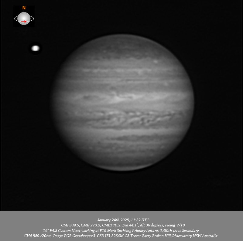 Detail resolved in these data A bright oval mid NTB only in CH4 data. A bright oval in the NEB adjacent to the NTrZ resolved at all wavelengths. A dark barge in the NEB with a disturbance emanating down to the P side of the barge at all wavelengths. Several prominent festoons in the EZ at all wavelengths. A v-compact bright spot mid SEB resolved in 685nm IR, R and RGB this is preceded by a larger compact bright spot. The SEB outbreak is well resolved at all wavelengths. A prominent small bright oval in the SSTB resolved at all wavelengths. A small bright oval in the SPR best seen in CH4 but also faintly resolved in 685nm IR, R and RGB.