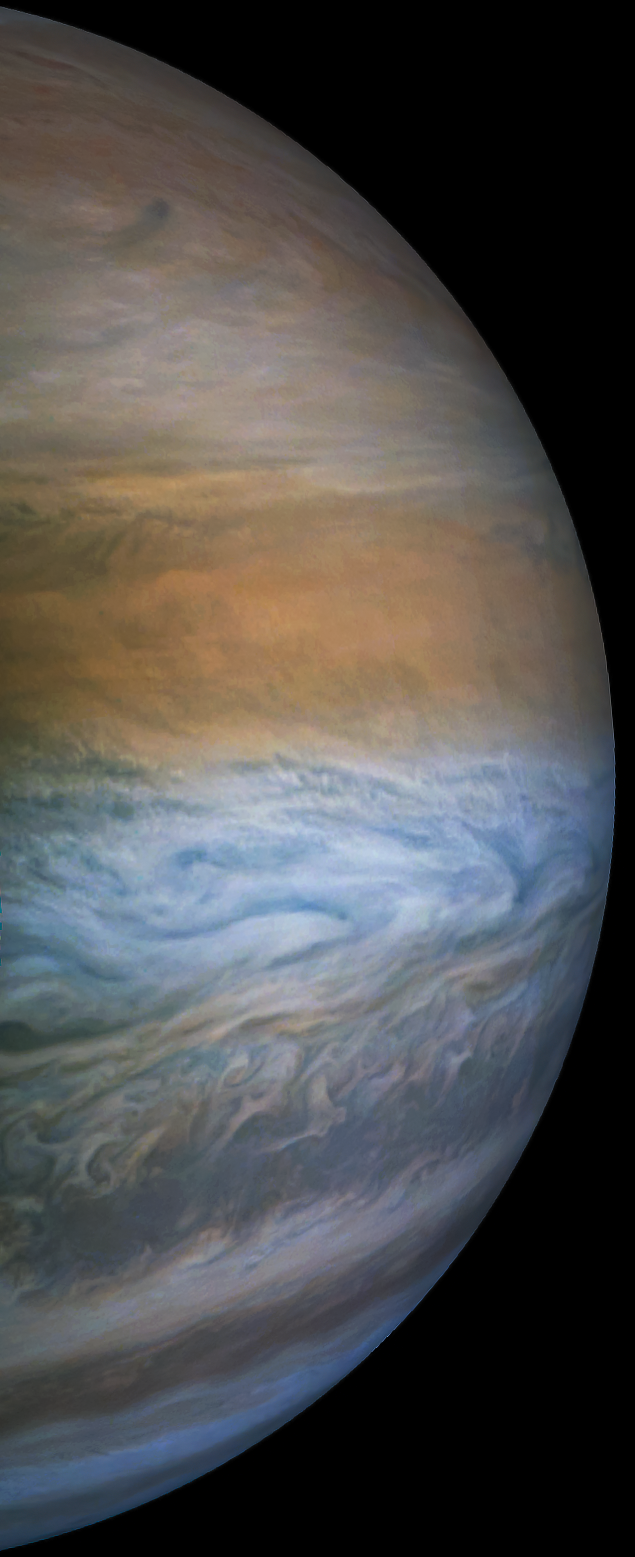 A close up colour and contrast. enhanced view of Jupiter's Southern Hemisphere. Very thin white clouds can be seen towards the centre.