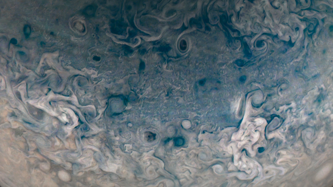 Processed using the JunoCam imager's PJ36 Northern Folded Filamentary Region raw images and data from NASA's Juno spacecraft flyby on September 2, 2021. Enhanced to highlight features, clouds, colours, and the beauty of Jupiter. Artist's impression - not representative of true colour.