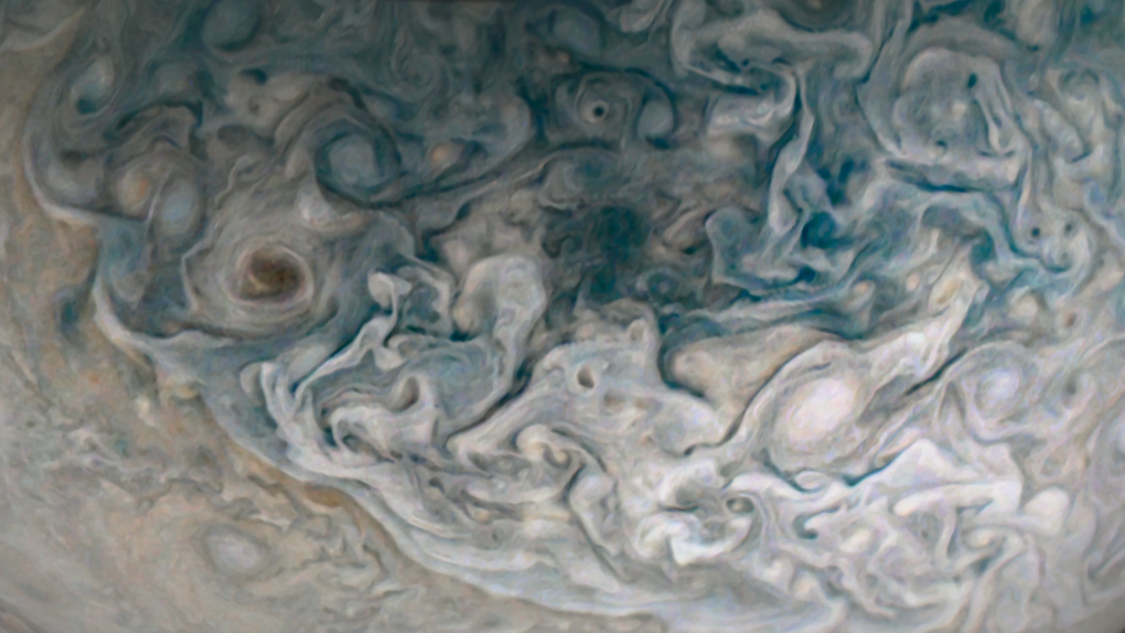 Processed using the JunoCam imager's PJ37 Northern Folded Filamentary Region raw images and data from NASA's Juno spacecraft flyby on October 16, 2021. Enhanced to highlight features, clouds, colours, and the beauty of Jupiter. Artist's impression - not representative of true colour.