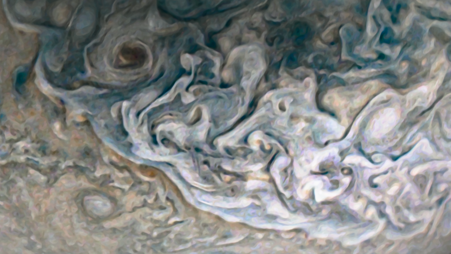 Processed using the JunoCam imager's PJ37 N5 raw images and data from NASA's Juno spacecraft flyby on October 16, 2021. Enhanced to highlight features, clouds, colours, and the beauty of Jupiter. Artist's impression - not representative of true colour.