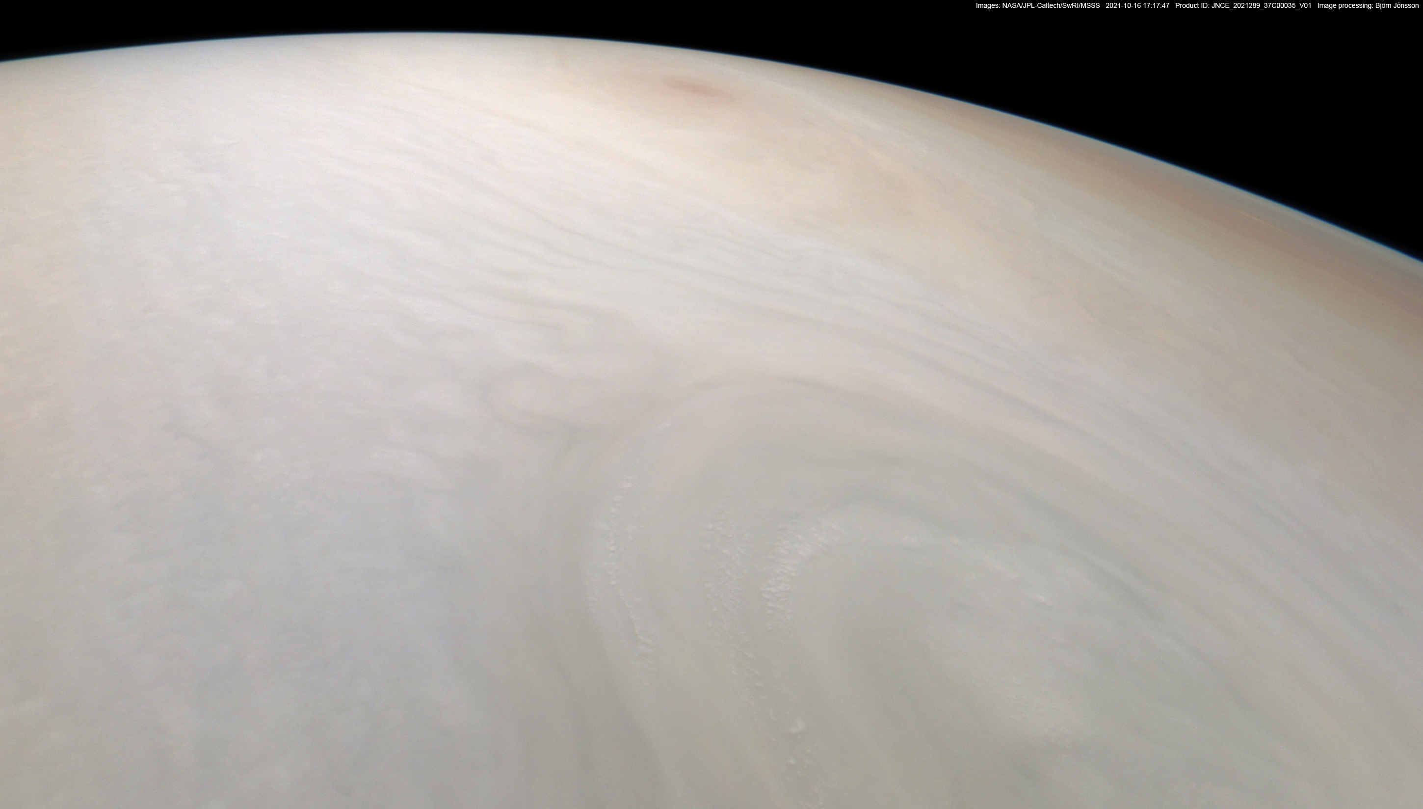 An approximately true color/contrast image processed from the PJ37_35 raw image framelets. North is to the left and slightly down.