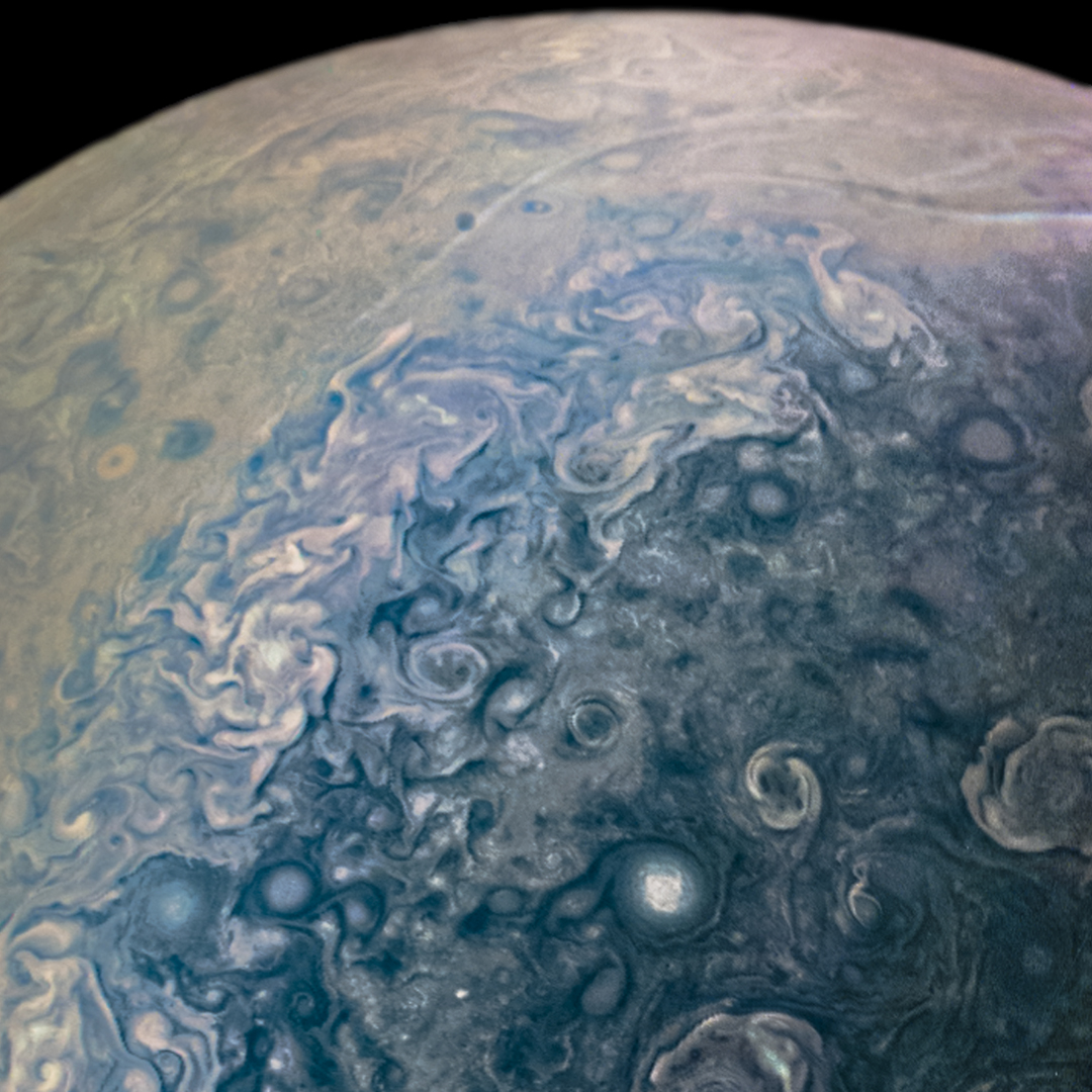 This image taken by Juno EPO CAMERA on 25/02/2022 shows the cyclones chaos formed on the Jovian North Pole, one of the strongest natural forces in our Solar System. Also, we can see the mess atmosphere bands after the main pole formations.