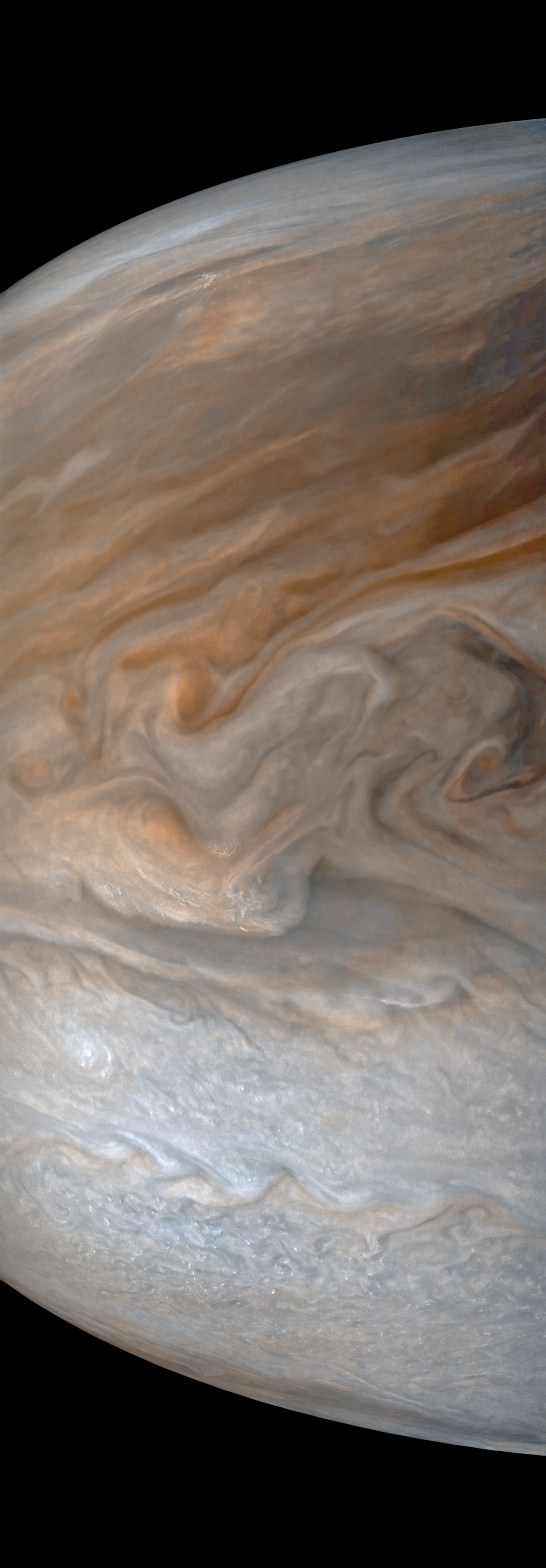 This image shows the complex swirl of clouds created by the jet stream at the southern boundary of the South Equatorial Belt. Small convective clouds bubble out of an eddy structure in the South Equatorial Belt. More widespread convective clouds dot the South Tropical Zone at bottom.