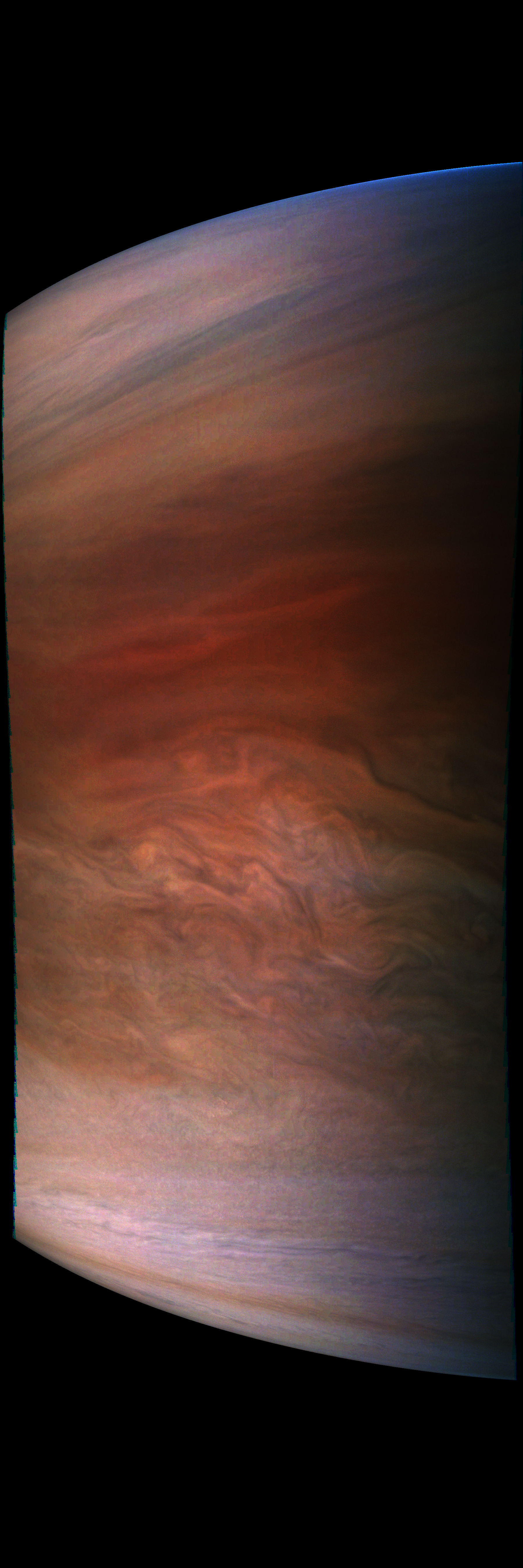 Junocam pixels are 12 bits deep from the camera but are converted to 8 bits inside the instrument using a lossless "companding" table, a process similar to gamma correction, to reduce their size. All Junocam products on the missionjuno website are in this 8-bit form as received on Earth. Scientific users interested in radiometric analysis should use the "RDR" data products archived with the Planetary Data System, which have been converted back to a linear 12-bit scale.