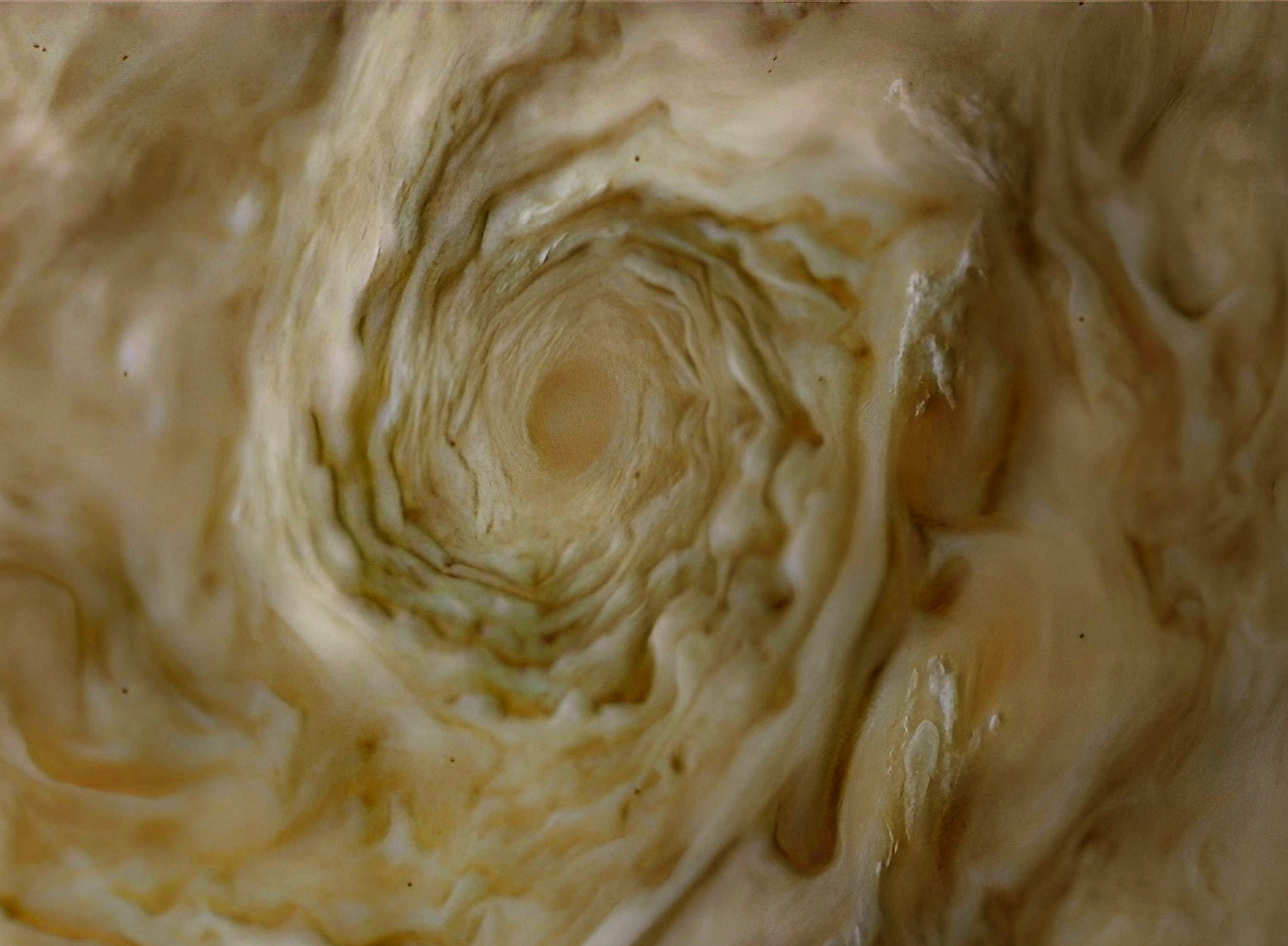 PJ36 - Northern Cyclone of Jupiter in artistic detail. Created from PJ36-34 Raw image. The colors are given to enhance the beauty of this cyclone.