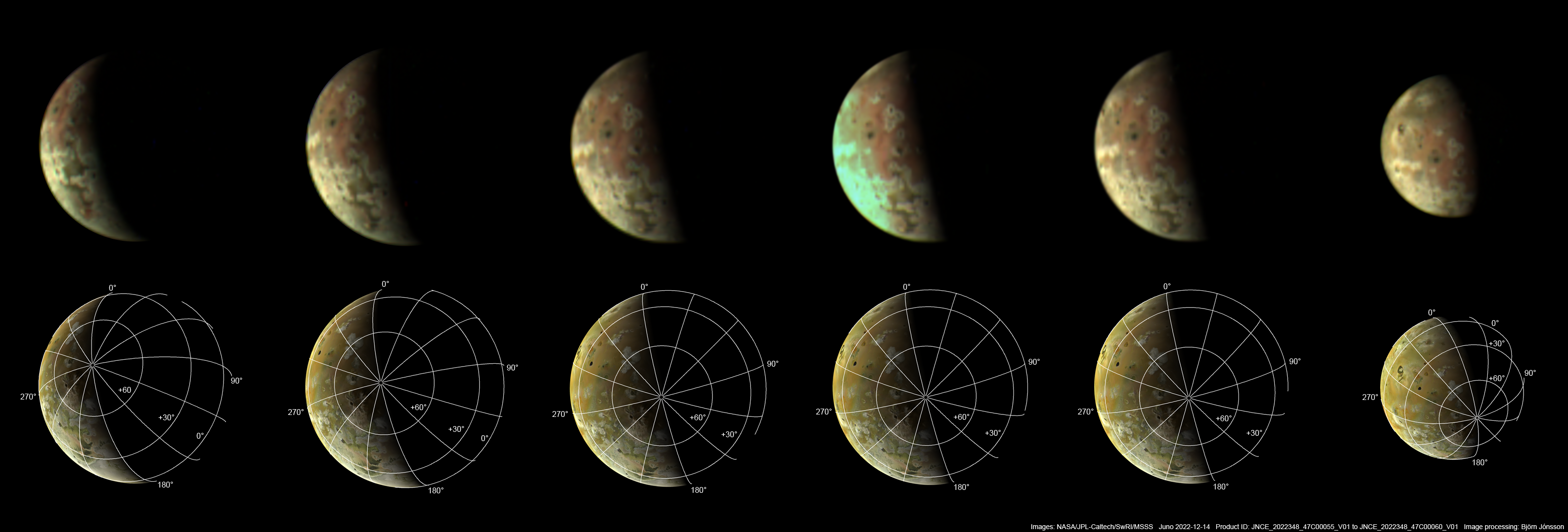A montage of the PJ47 JunoCam images of Io. The images are enlarged by a factor of 5 relative to the original data. One of the images was obtained with a relatively long exposure time, causing parts of the image to become overexposed/saturated. The color balance is preliminary but hopefully this is not very far from Io's real color. The viewing geometry is also shown using computer generated images that include a latitude/longitude grid. They are based on a Voyager/Galileo map of Io.