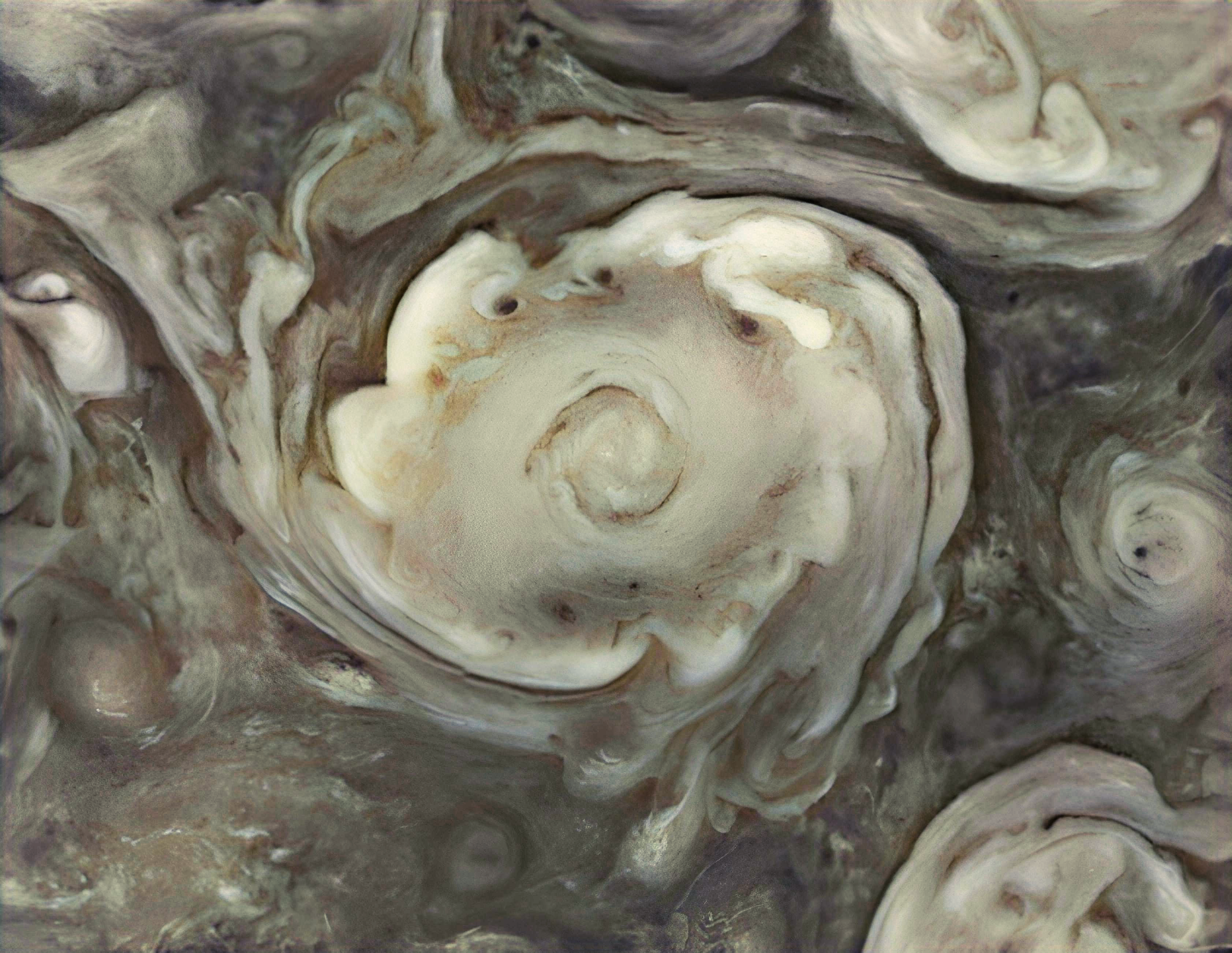 The highly exaggerated and enhanced image of a circumpolar cyclone captured by Junocam on its 43rd Perijove on July 5th, 2022. Note that the colors in the image are not representative of the actual colors.