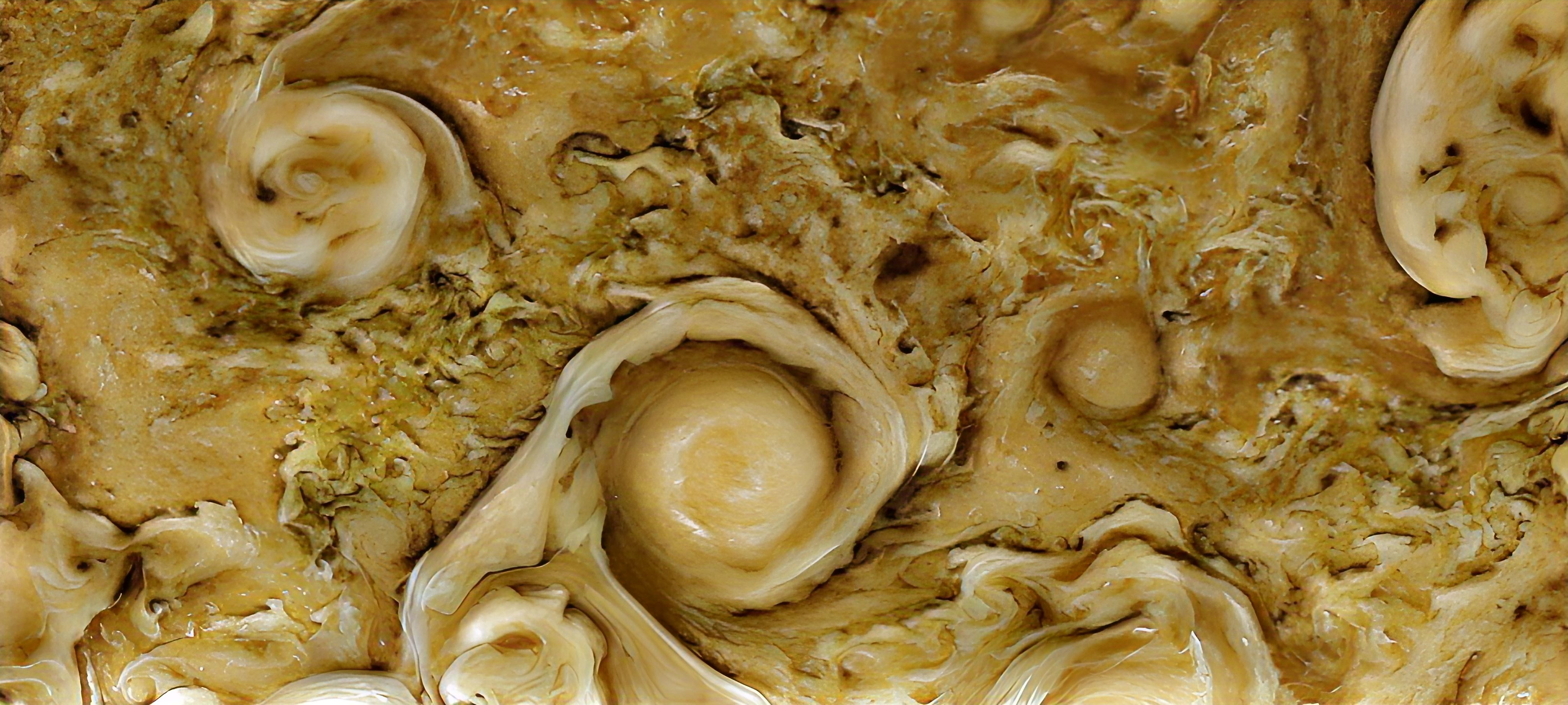 A highly enhanced and exaggerated view of the northern clouds of Jupiter near the northern circumpolar cyclones, taken by Junocam on its 43rd Perijove on 2022-07-05.