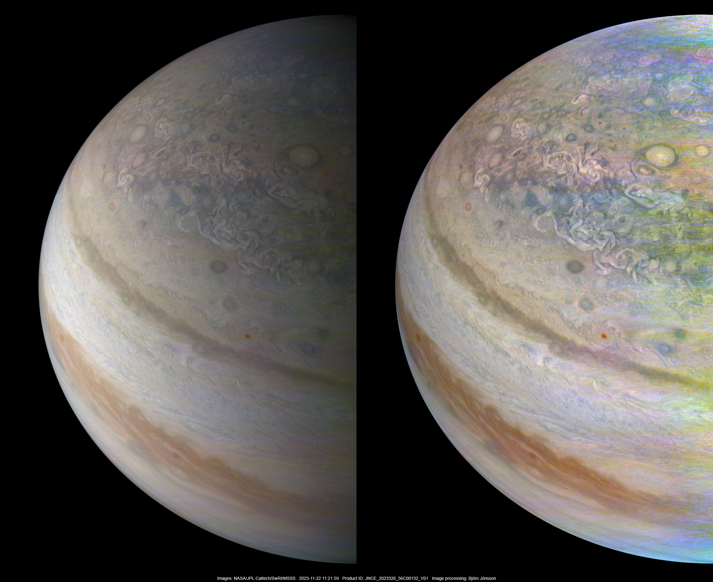 Two versions of image PJ56_132 showing Jupiter's northern hemisphere: An approximately true color/contrast version (left) and an illumination-adjusted contrast enhanced version (right). North is up.