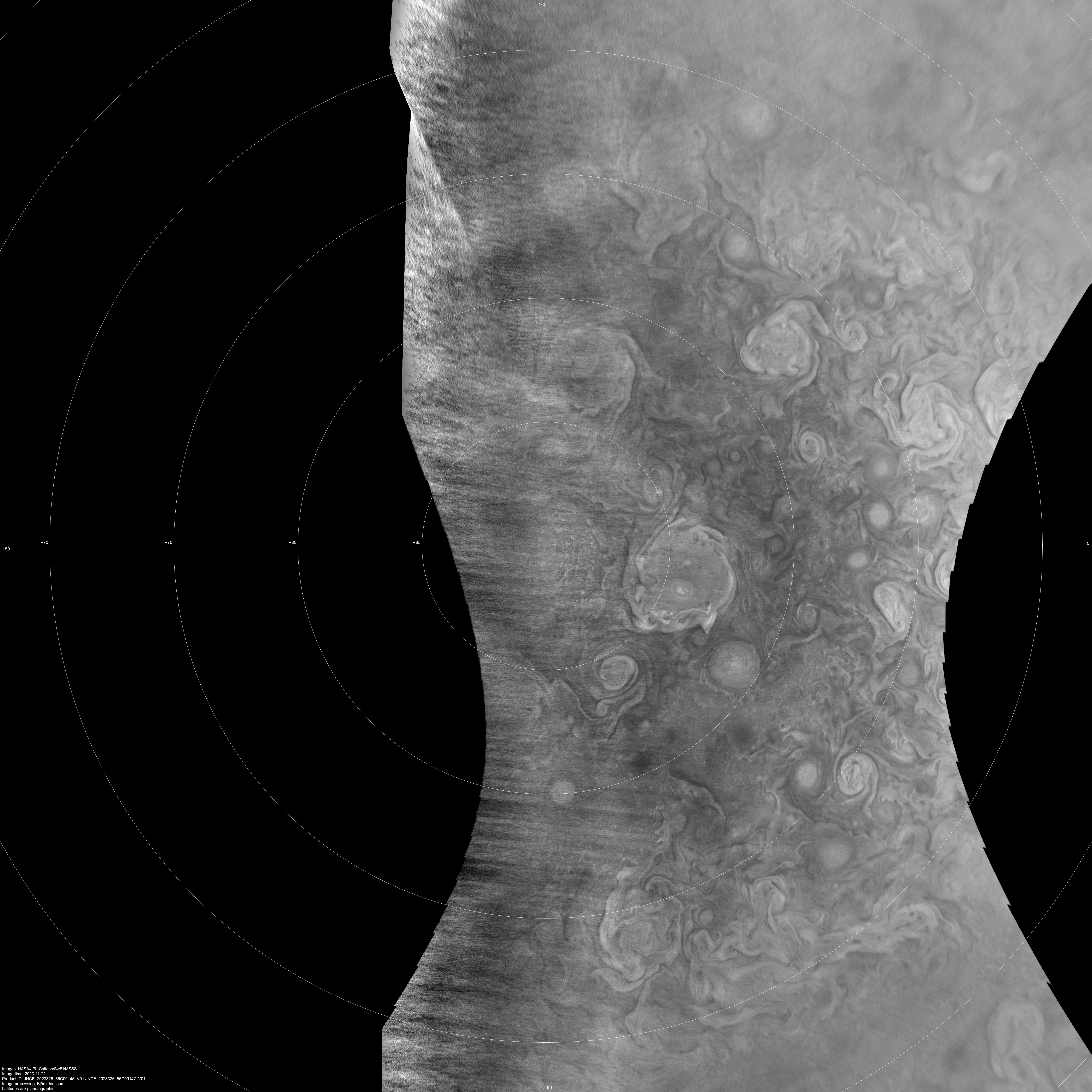 A heavily processed north polar projection map showing Jupiter's north polar region. It is a mosaic of two images, PJ56_145 and PJ56_147.