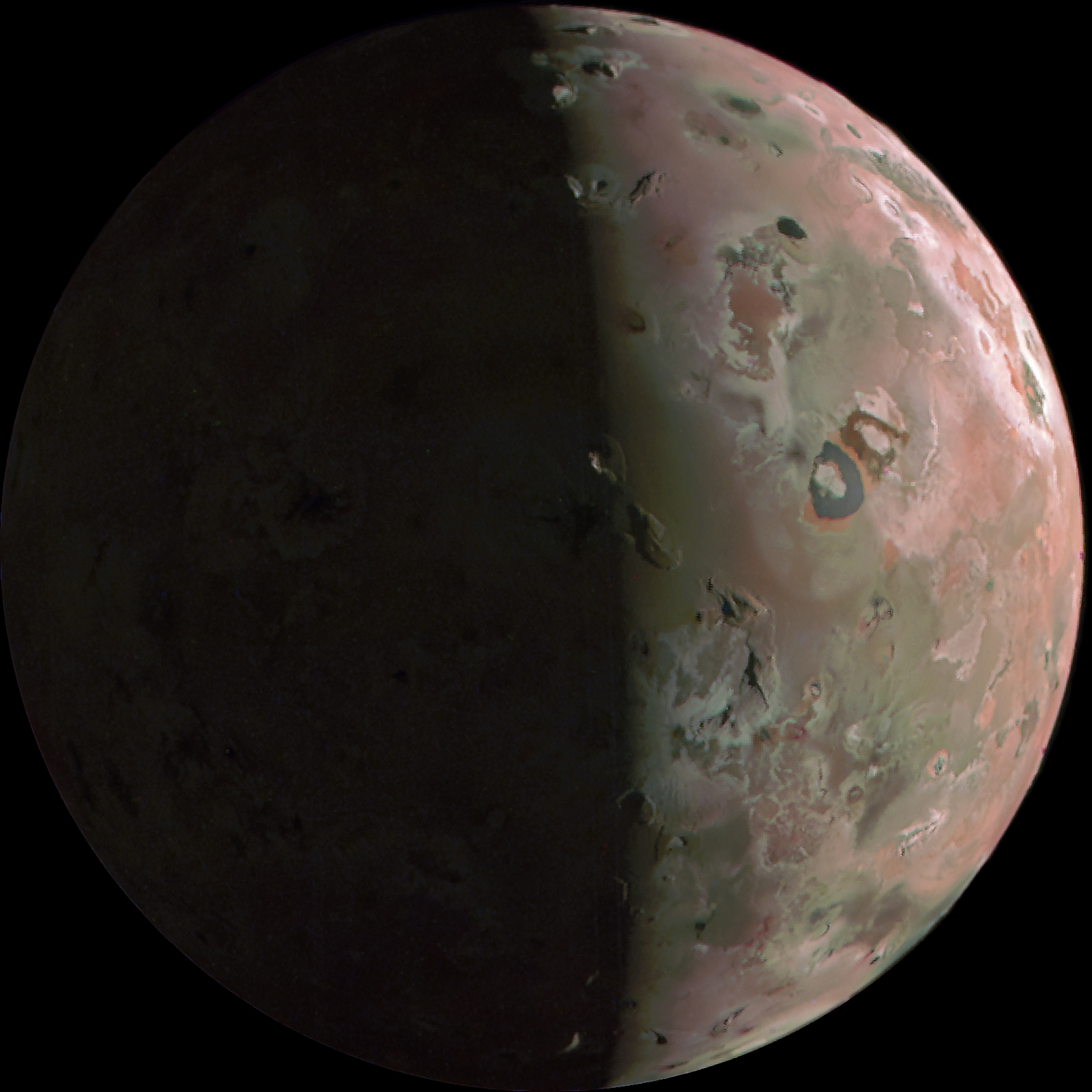 Second impressive detailed Io image. This view includes features on the southern parts of Io's surface than the previous image. Io has many stunning surface features in this image: Mountains, craters, volcanic vents, pools and solidified flows of lava.