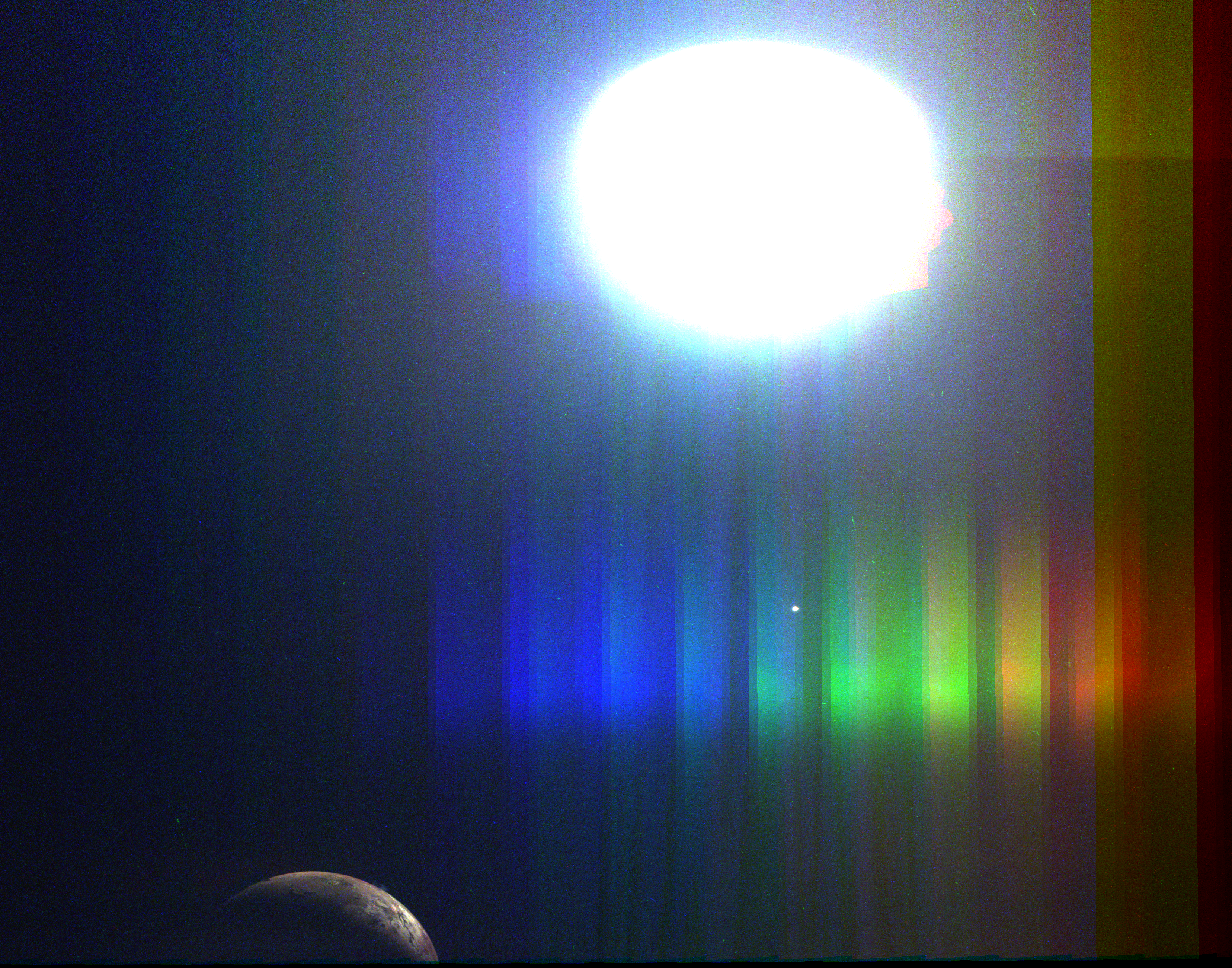 We have a methane filter, included for the polar science investigation, that is almost at the limits of our detector’s wavelength range. To get enough photons for an image we need to use a very long exposure. In some images this results in scattered light in the image. For science purposes we will simply crop out the portions of the image that include this artifact. Work is in progress to determine exactly what conditions cause stray light problems so that this can be minimized for future imaging.