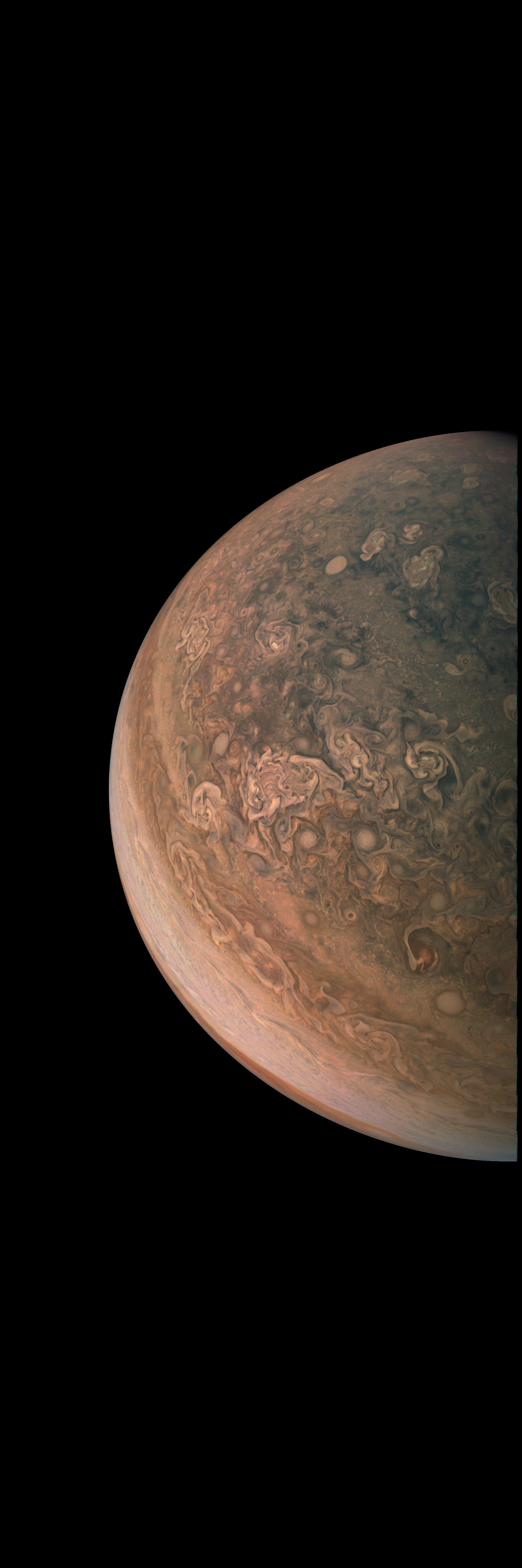 Resolution is 30 pixels per degrees in an equidistant cylindrical system centered to the camera at image stop time, with an axis parallel to Juno's spin axis. The rendered field of view is 60x180 degrees.