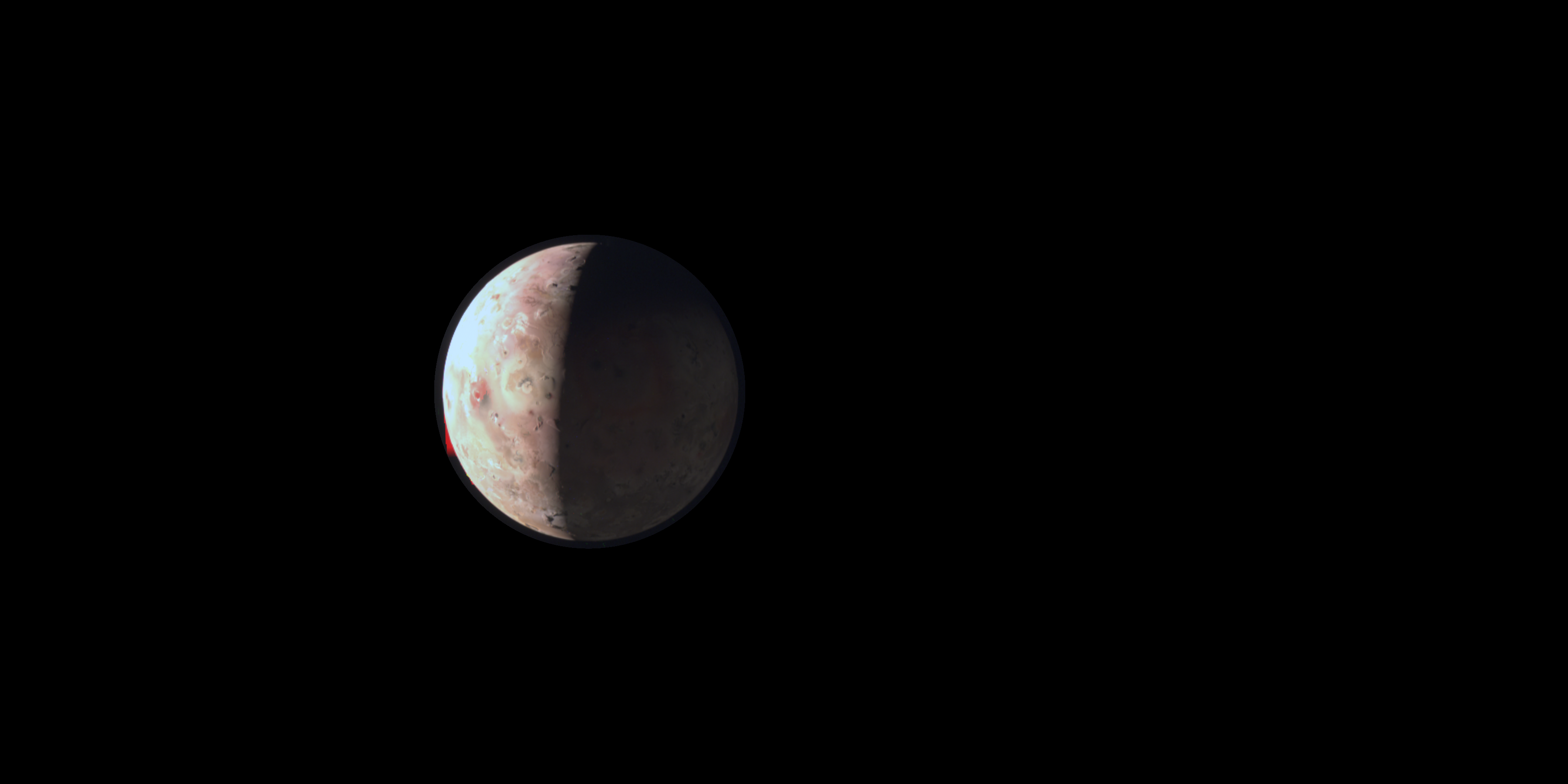The raw image was reprojected to a sphere with a radius 100 km greater than Io's nominal radius. This allows the inclusion of mountains and portions of volcanic plume. Some of the camera artefacts are mostly patched. Neither illumination adjustment nor enhancemant was applied. Applied radiomentric factors are (0.734; 1.0; 3.023) for (R;G;B); those weights white-balanced PJ54 Jupiter images to grey on average. Resolution is 60 ppd. Projection is spherical equirectanguar centered to JunoCam at image stop time with a rendered field of view of 60° x 30°.