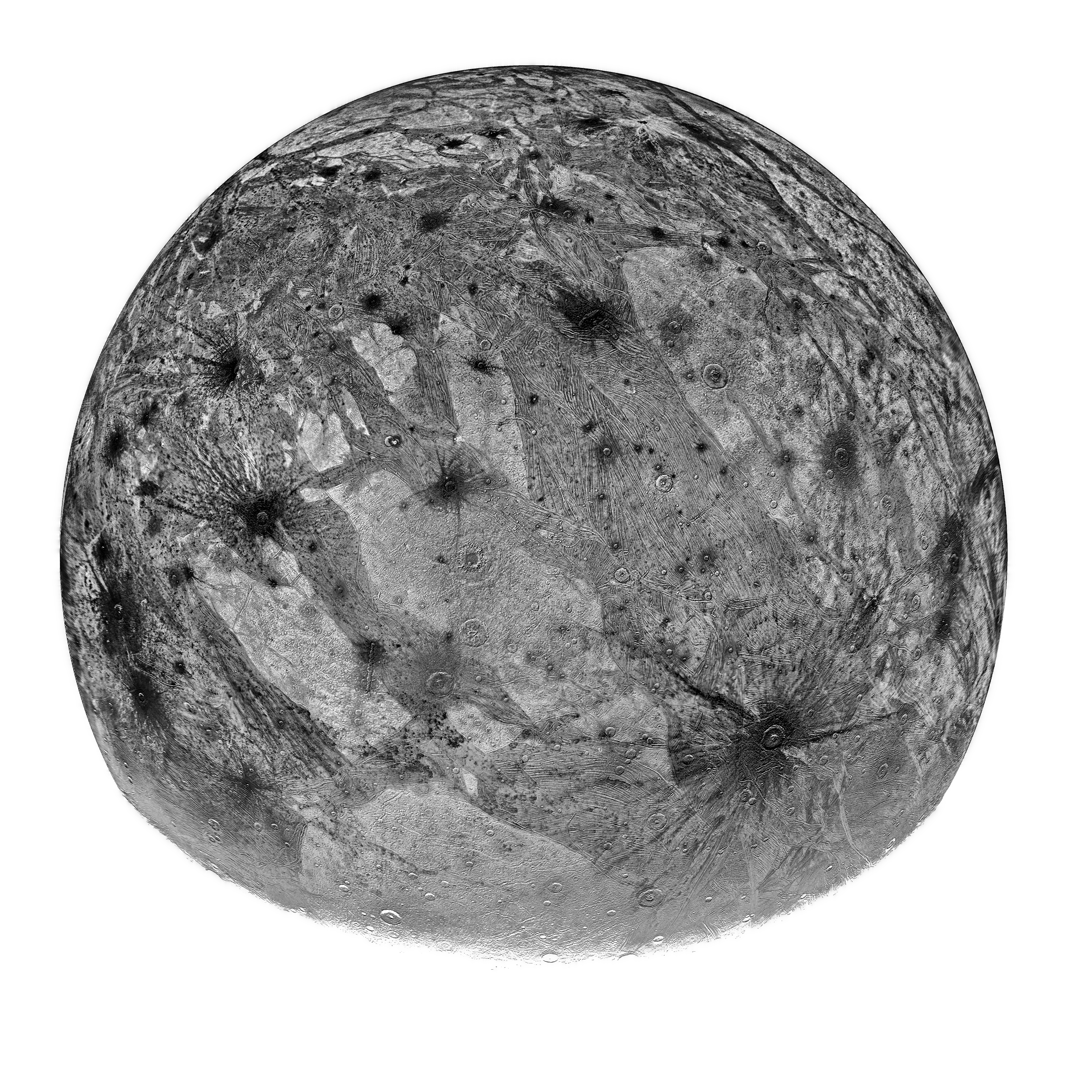 Process on an image processed by Kevin M. Gill who made a composite image of Ganymede withJNCE_2021158_34C00001_V01 JNCE_2021158_34C00002_V01 JNCE_2021158_34C00003_V01 / I processed the composite image to see soil characteristics (enhancement and BW process)