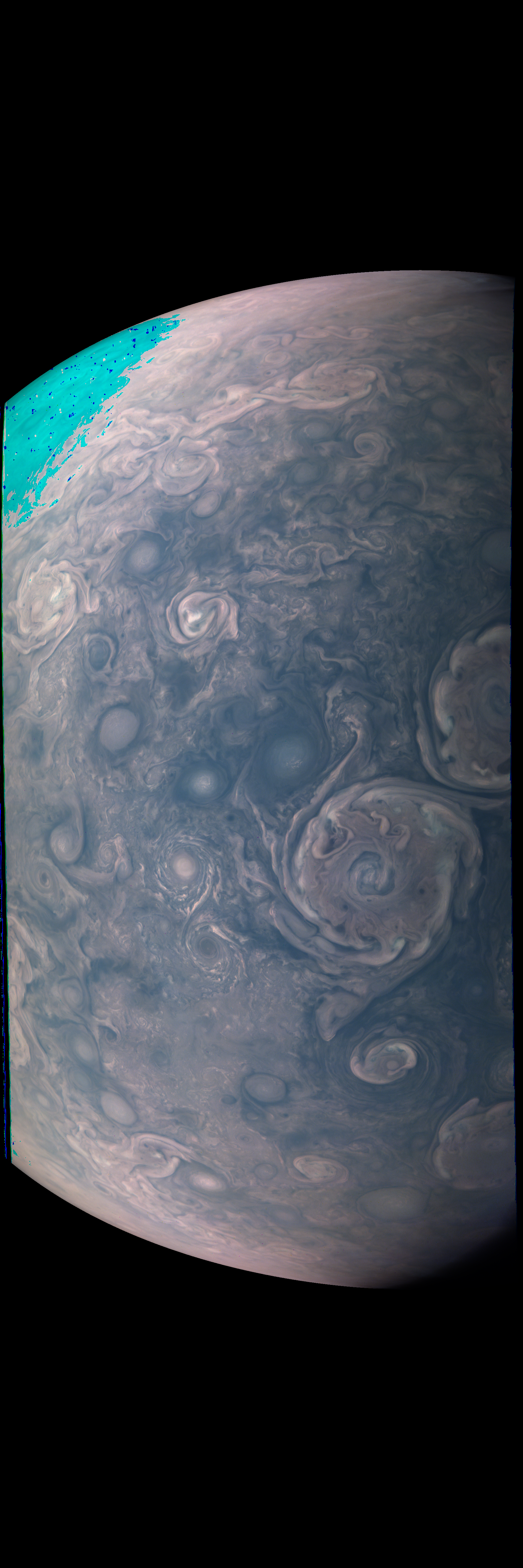 Resolution is 30 pixels per degrees in an equidistant cylindrical system centered to the camera at image stop time, with an axis parallel to Juno's spin axis. The rendered field of view is 60x180 degrees.