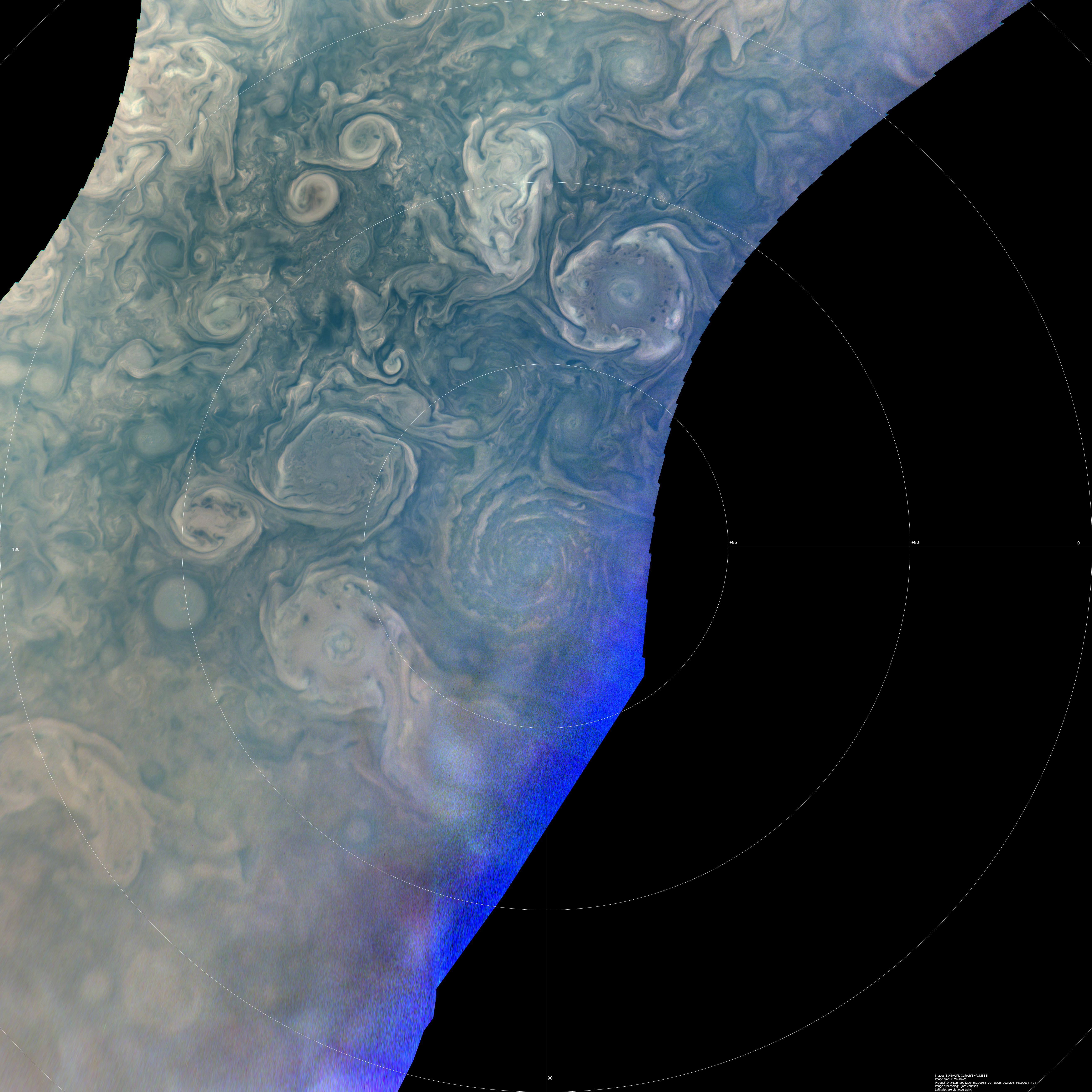An enhanced north polar projection map mosaic showing Jupiter's north polar region. It is created from raw images PJ66_33 and PJ66_34. The contrast has been enhanced and the colors exaggerated. Latitudes in the map are planetographic.
