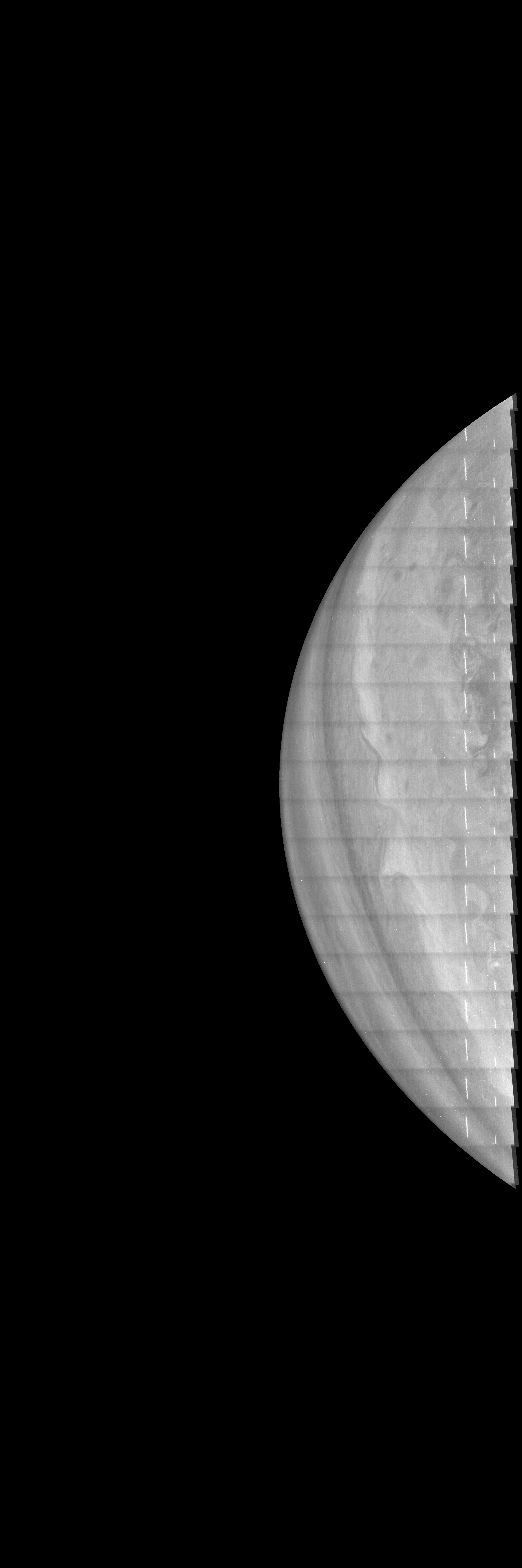 Resolution is 30 pixels per degree in an equidistant cylindrical frame centered to the camera at image stop time, with an axis parallel to Juno's spin axis. The rendered field of view is 60x180 degrees.