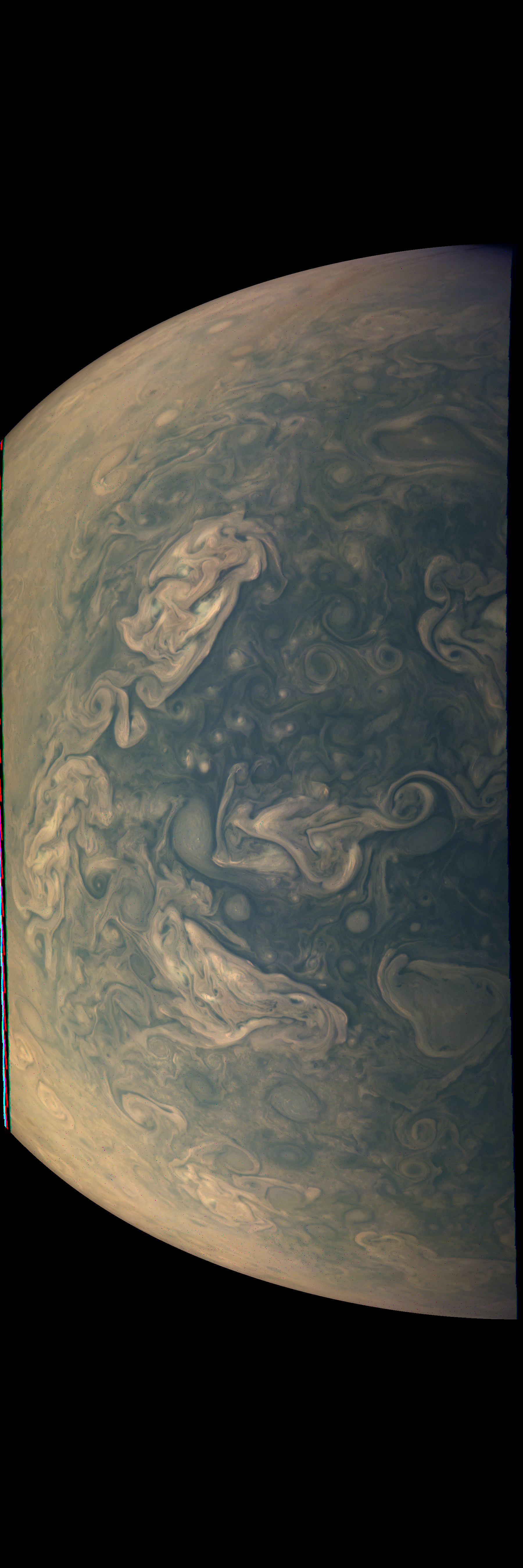 Resolution is 30 pixels per degrees in an equidistant cylindrical system centered to the camera at image stop time, with an axis parallel to Juno's spin axis. The rendered field of view is 60x180 degrees.