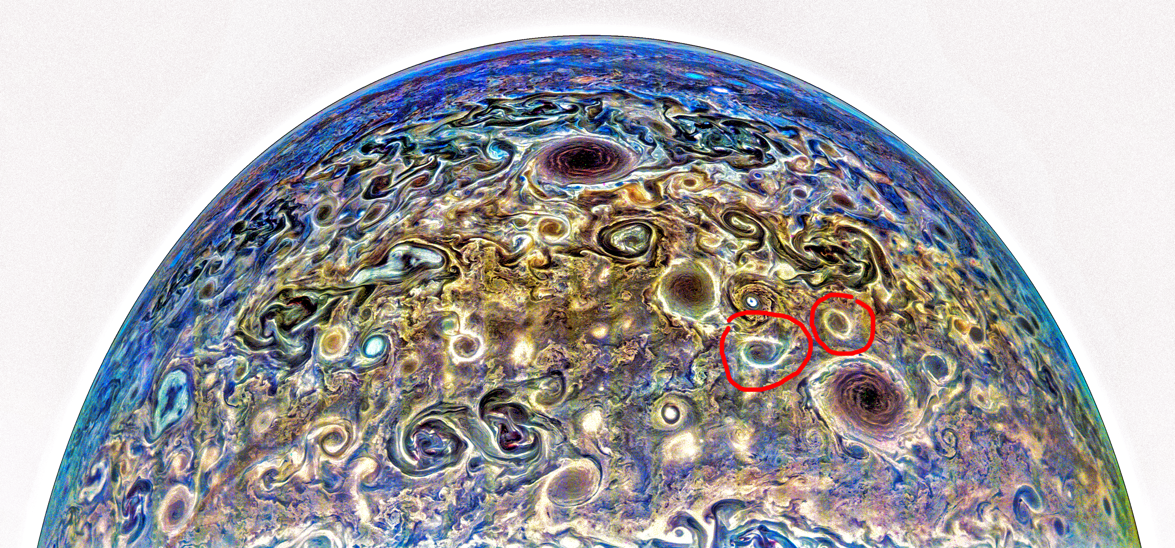 Negative image. Maybe this is how Junocam shows us, almost live, the birth or death of a Jovian polar cyclone - a luminous ring that still hesitates to close. Two red circles have been added to show the difference.