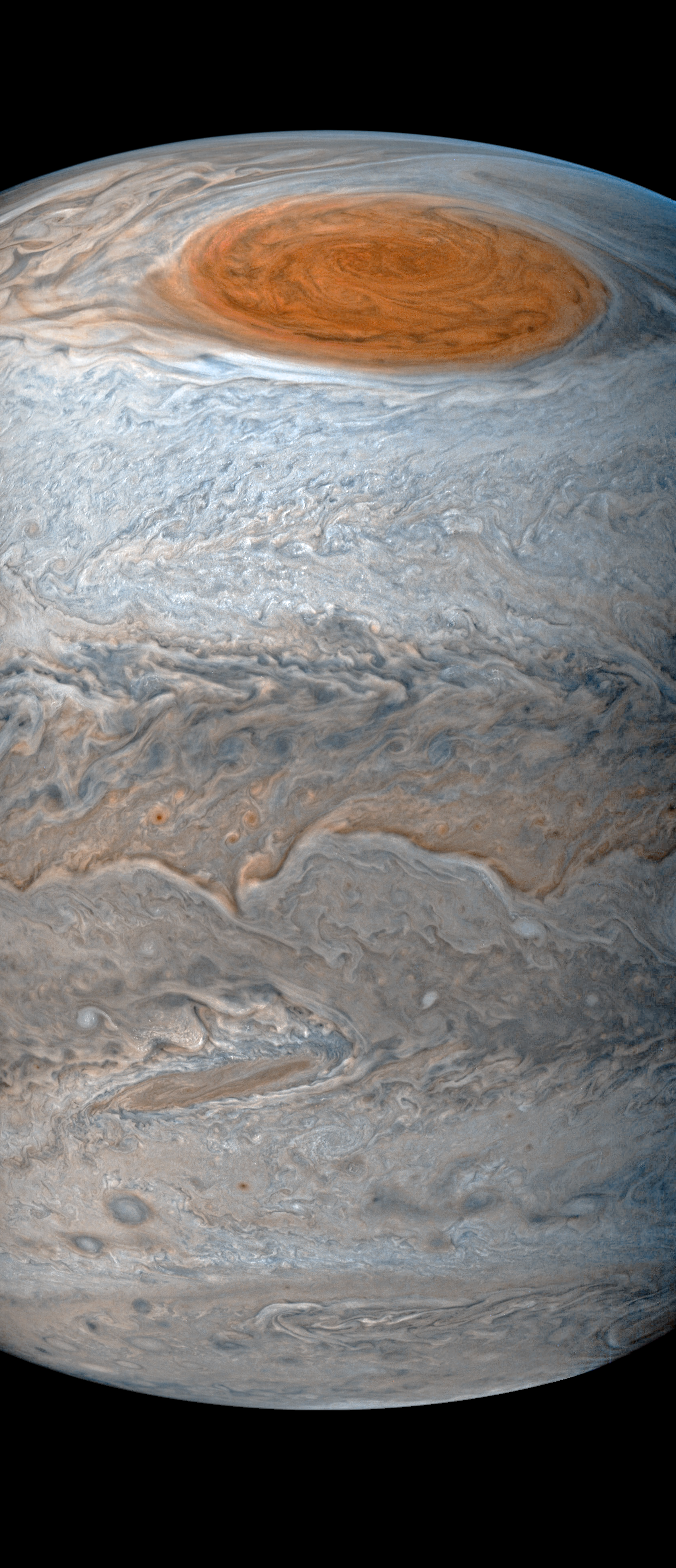Perijove 7 image #062 with moderate contrast enhancement and white balancing. Juno was located 16500 km over the South Temperate Belt. Looking north, JunoCam saw numerous small "popcorn" storms in the South Tropical Zone, as well as the Great Red Spot and South Equatorial Belt on the horizon.