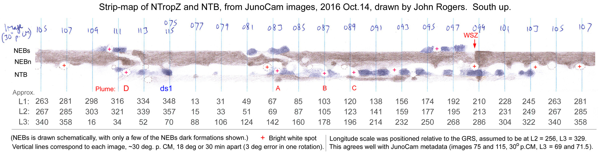 Making a map from the JunoCam images will be challenging because of the low resolution, crescent phase, and changes in relative intensities across the disk. Instead, I made a map from the final rotation on Oct.14 by the good old-fashioned method of pencil drawing.