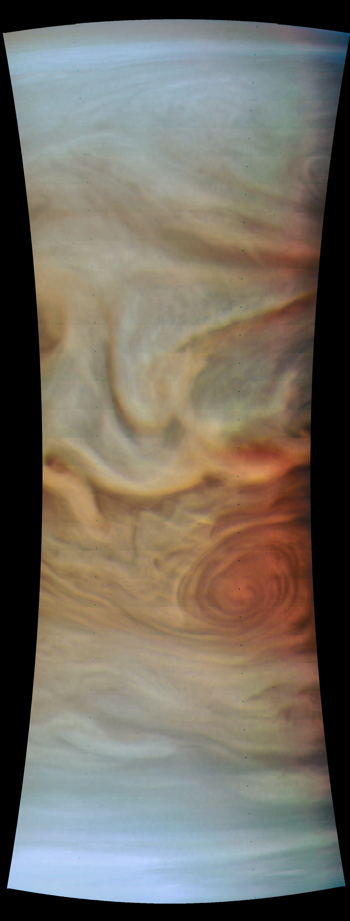 Junocam pixels are 12 bits deep from the camera but are converted to 8 bits inside the instrument using a lossless "companding" table, a process similar to gamma correction, to reduce their size. All Junocam products on the missionjuno website are in this 8-bit form as received on Earth. Scientific users interested in radiometric analysis should use the "RDR" data products archived with the Planetary Data System, which have been converted back to a linear 12-bit scale.