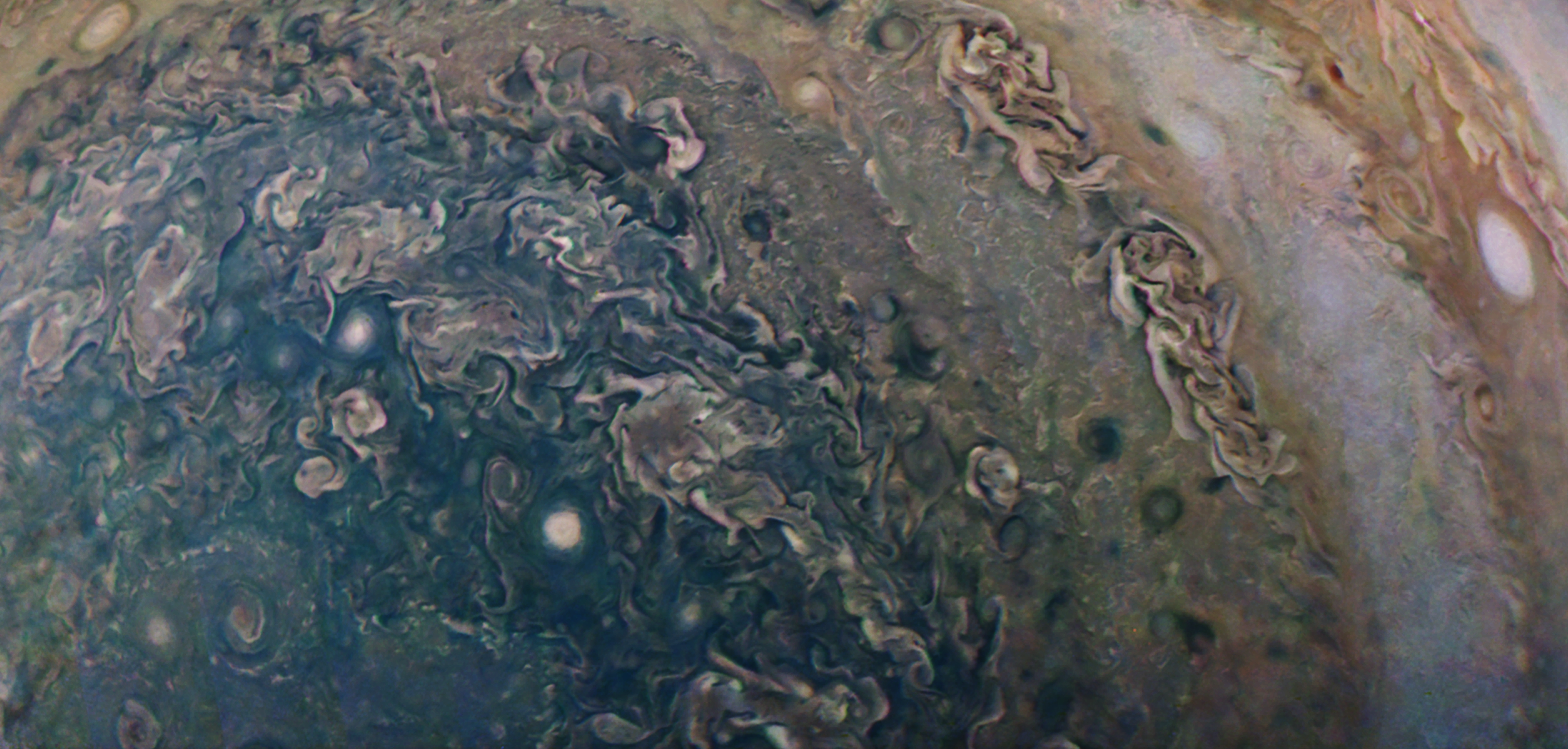 A large, colorful view of the south pole a frame of the Perijove 6 time lapse sequence.