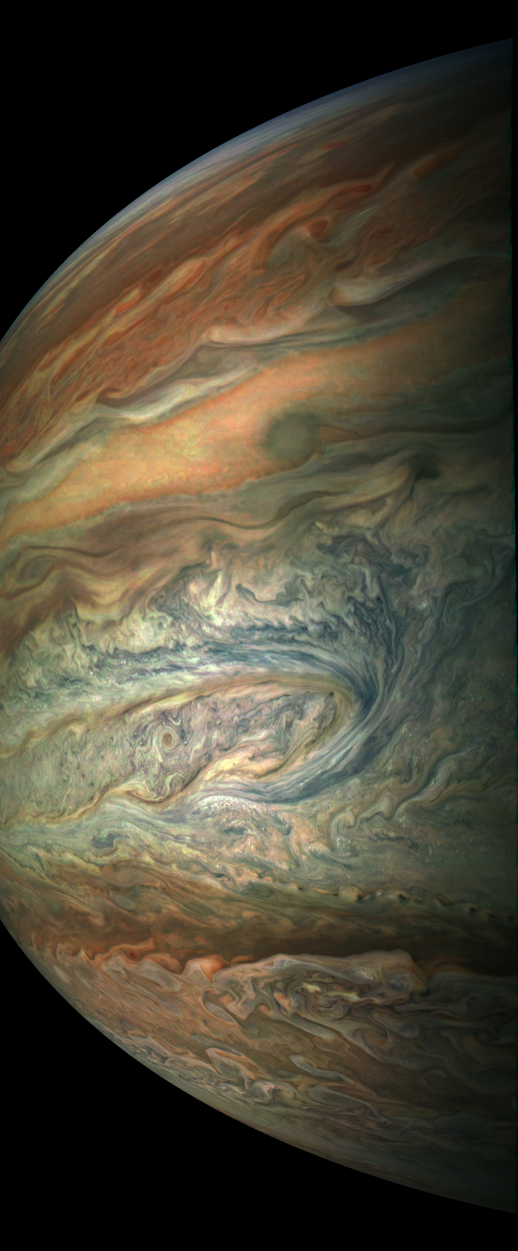 This image is derived directly from the raw image consisting of framelets taken while JunoCam was rotating together with Juno.
