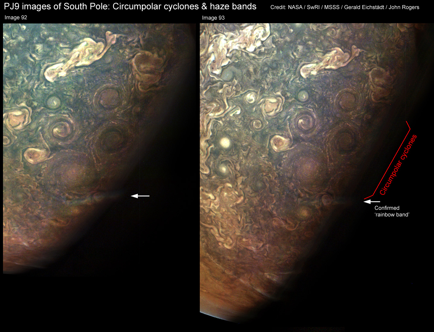 These images show the circumpolar cyclones at the south pole, and lying over the edge of one of them, an example of a 'rainbow band' (bright haze band fringed with red on one side and blue on the other side) that is confirmed in 2 images. This is from a report on the PJ9 images, posted on the BAA Jupiter Section web site at: https://britastro.org/node/11780