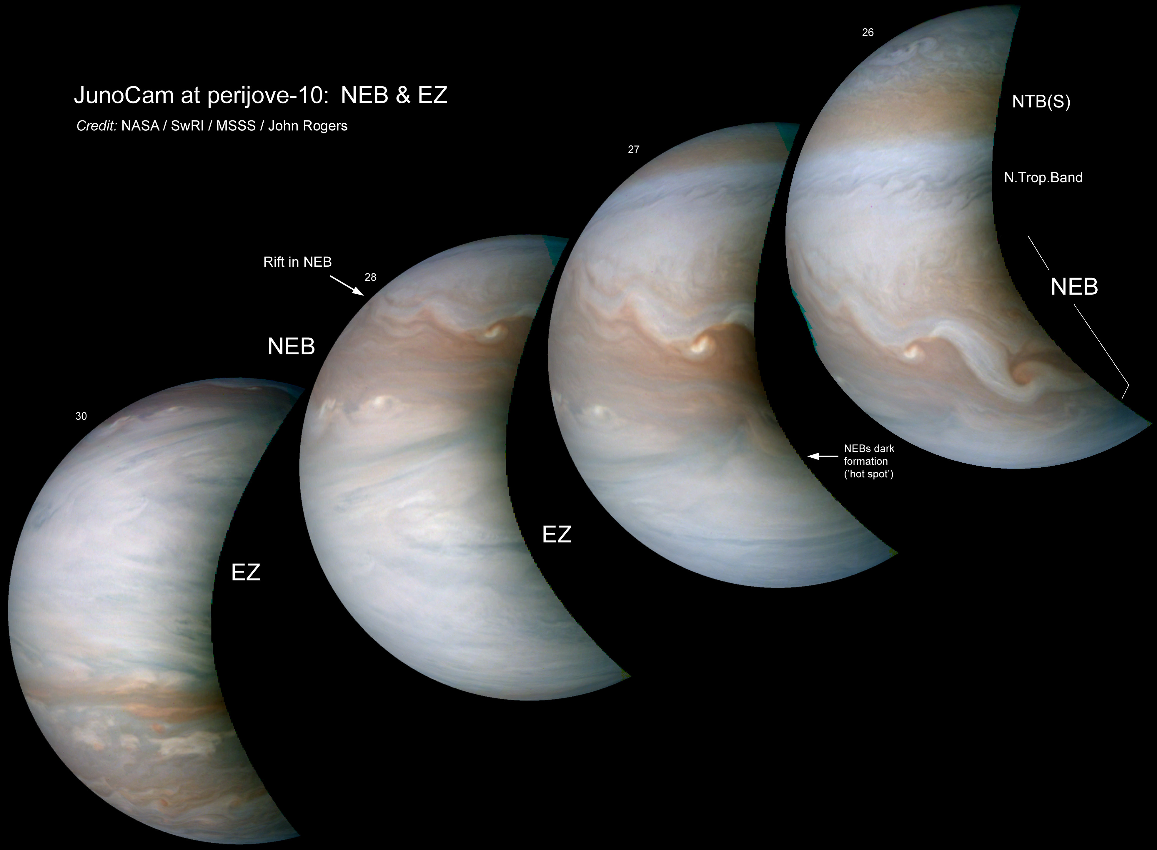 These 4 images cover the same sector of the NEB, with a well-developed sinuous 'rift' stretching diagonally through it, and a bright new cloud eruption adjacent. On the NEBs edge, we see a typical dark formation (‘hot spot’) and two bright plume nuclei. --John Rogers