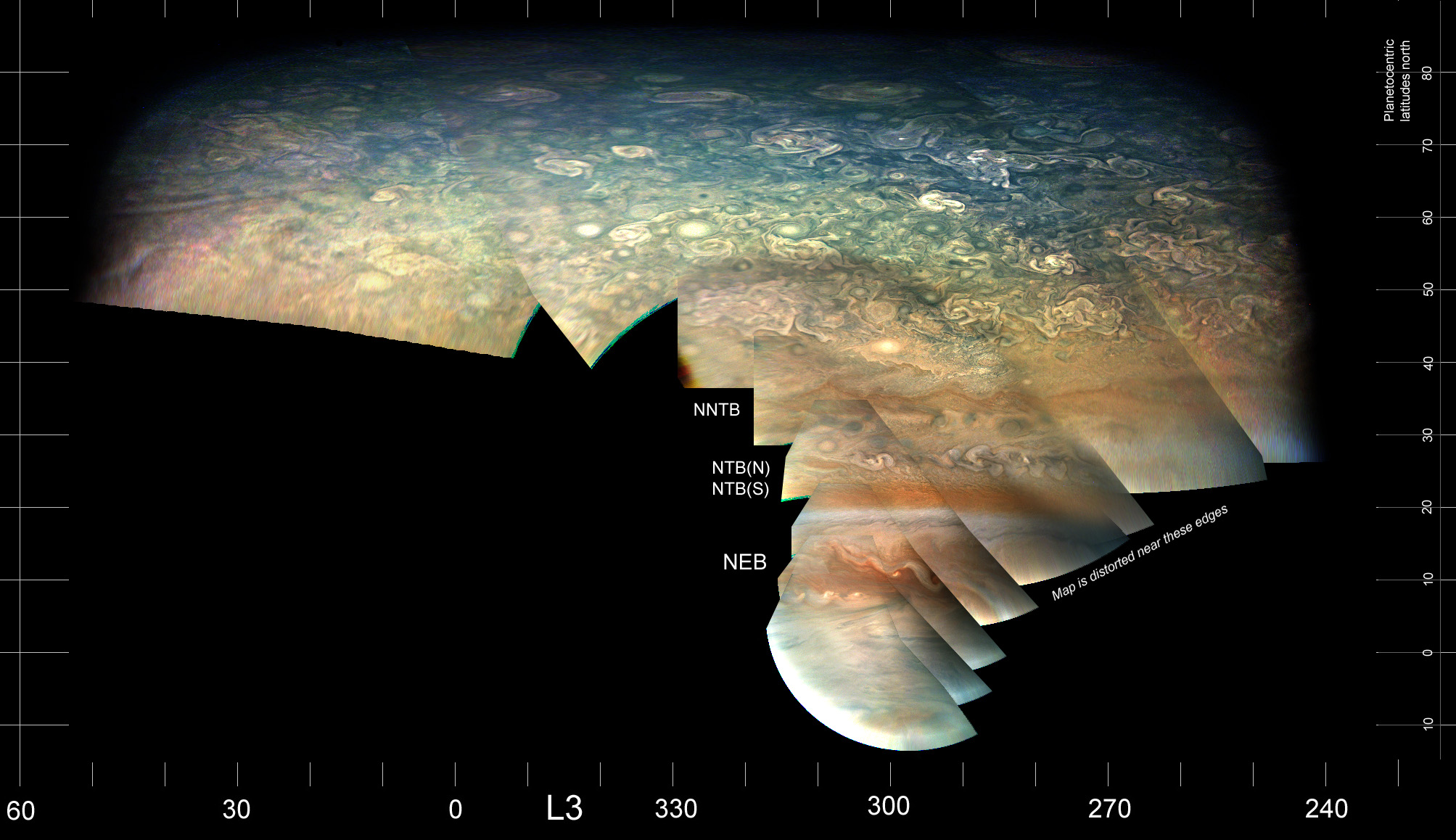 This is a cylindrical projection map made from the closeup images of the northern hemisphere at PJ10, putting the disturbances seen in the closeup images into context.