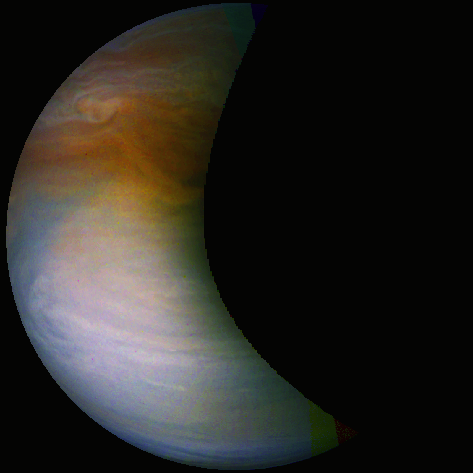 Junocam pixels are 12 bits deep from the camera but are converted to 8 bits inside the instrument using a lossless "companding" table, a process similar to gamma correction, to reduce their size. All Junocam products on the missionjuno website are in this 8-bit form as received on Earth. Scientific users interested in radiometric analysis should use the "RDR" data products archived with the Planetary Data System, which have been converted back to a linear 12-bit scale.