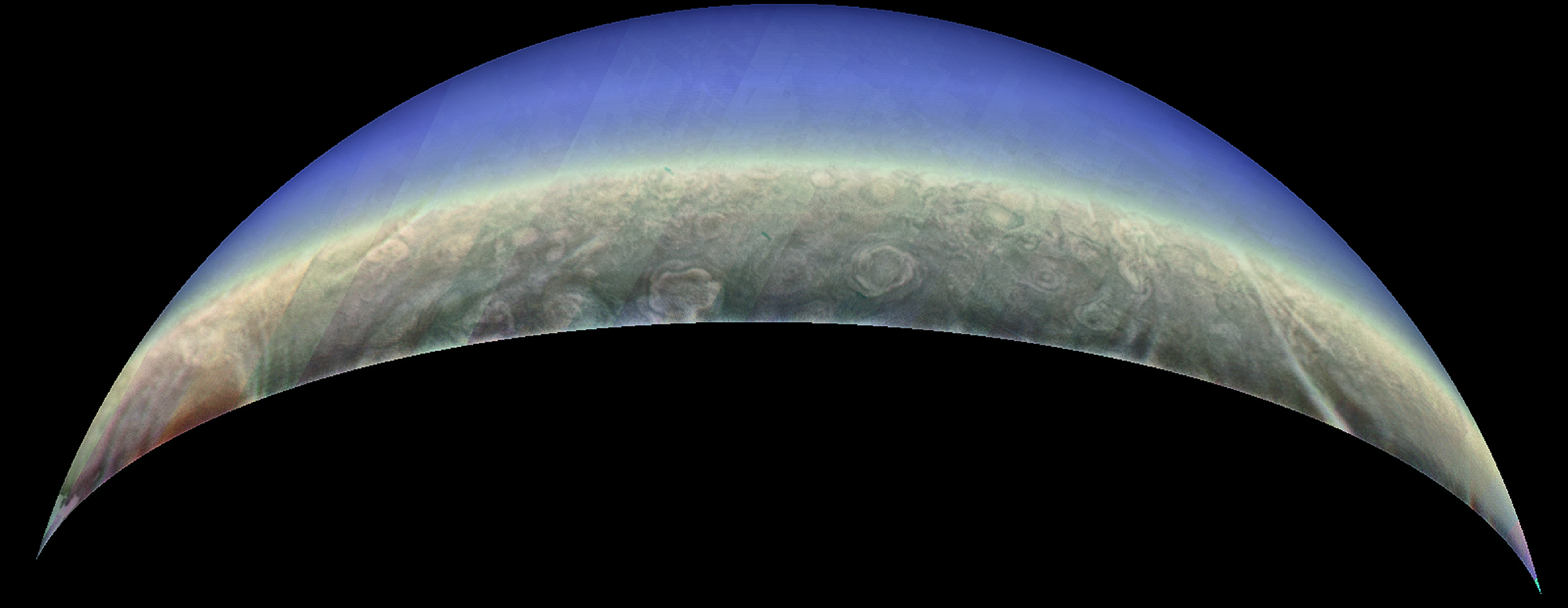 Junocam pixels are 12 bits deep from the camera but are converted to 8 bits inside the instrument using a lossless "companding" table, a process similar to gamma correction, to reduce their size. All Junocam products on the missionjuno website are in this 8-bit form as received on Earth. Scientific users interested in radiometric analysis should use the "RDR" data products archived with the Planetary Data System, which have been converted back to a linear 12-bit scale.