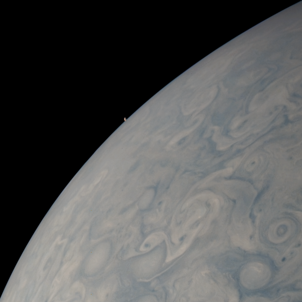 This image captures Io as it sets behind Jupiter from Juno's vantage point. This perspective was taken from an altitude of ~15000 km when the spacecraft was located over Jupiter's high northern latitudes.