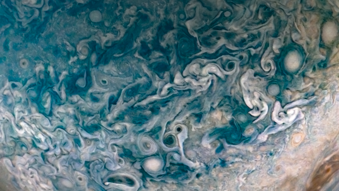 Processed using the JunoCam imager's Perijove 21 JET N7 raw images and data from NASA's Juno spacecraft flyby on July 21, 2019. Enhanced to highlight features, clouds, colours, and the beauty of Jupiter. Artist's impression - not representative of true colour.