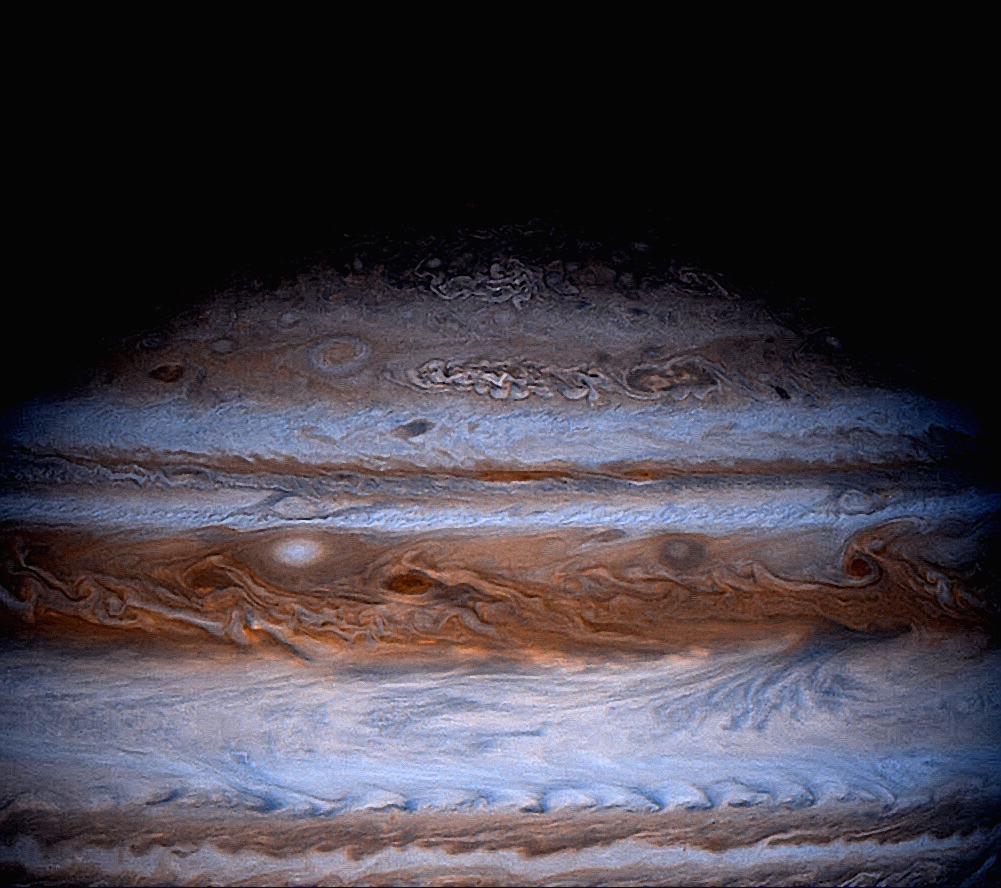This image shows the differences of the Northern Hemisphere Bands as you approach the northern pole. Enhanced coloring, contrast, & sharpening tools were used to reveal fine details. Image used: PIA02856.