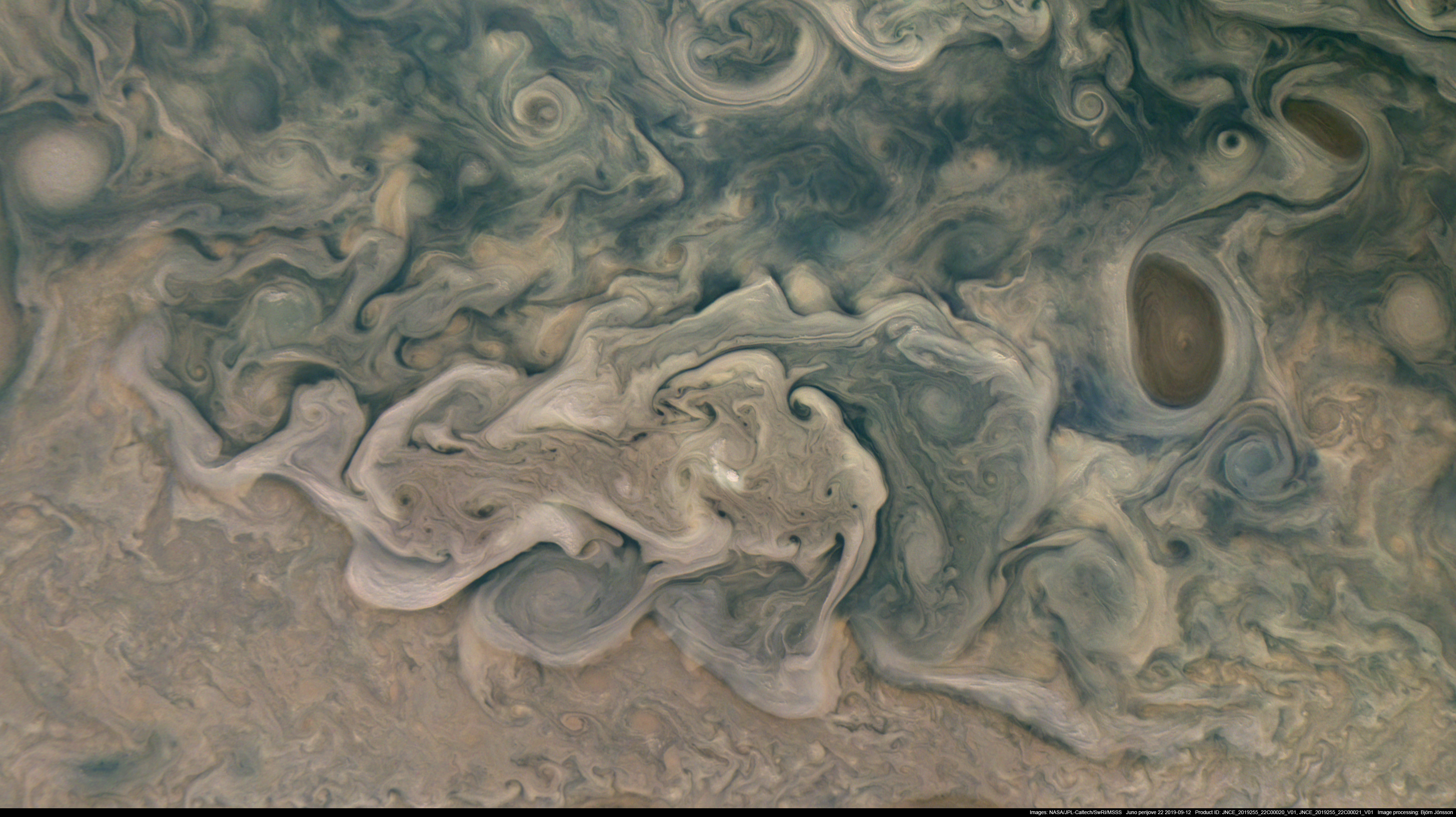 An enhanced orthographic mosaic of images PJ22_20 and PJ22_21. The small and very bright cloud below center is located near planetographic latitude 51.6 degrees north and is about 250 km across. The effects of the varying solar illumination across the image have been removed (otherwise the northern half of the image would be even darker relative to the southern half than it is here). Color variations have been enhanced and the contrast increased. This reveals lots of interesting details, including cloud shadows and evidence of vertical relief in the clouds. Many interesting and beautiful small ovals are also visible. Some of these appear to be connected by 'lanes'. An obvious example is the pair of brownish ovals at upper right. North is up in the image.