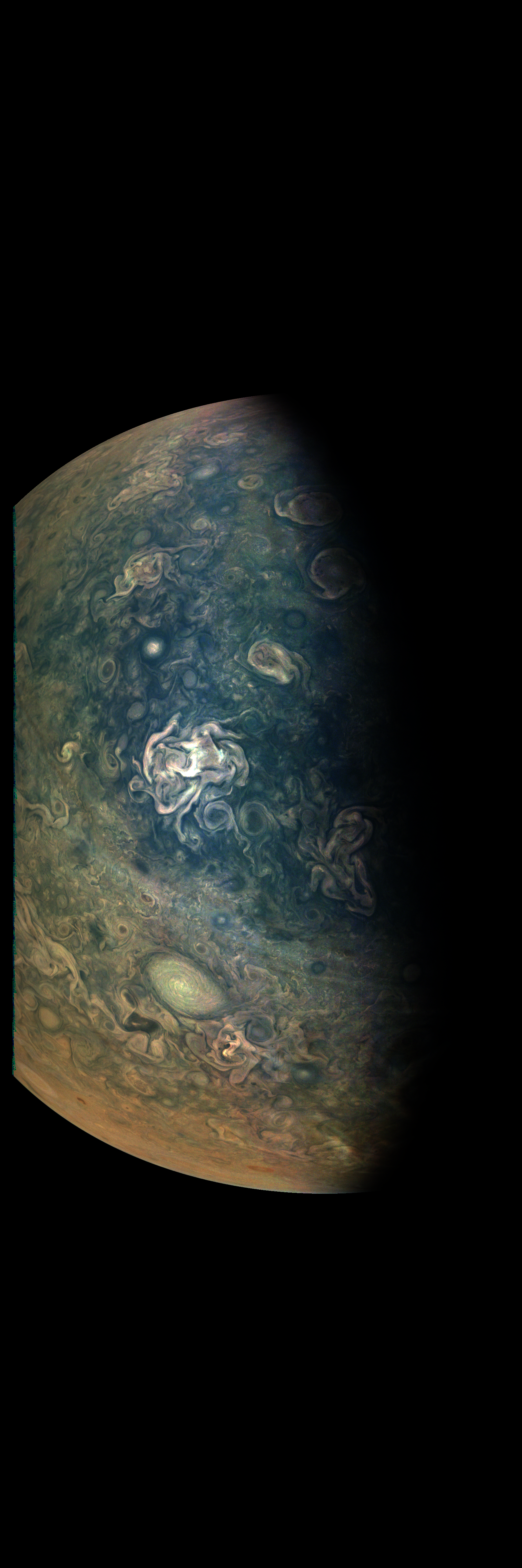 Resolution is 30 pixels per degrees in an equidistant cylindrical system centered to the camera at image stop time, with an axis parallel to Juno's spin axis. The rendered field of view is 60x180 degrees.