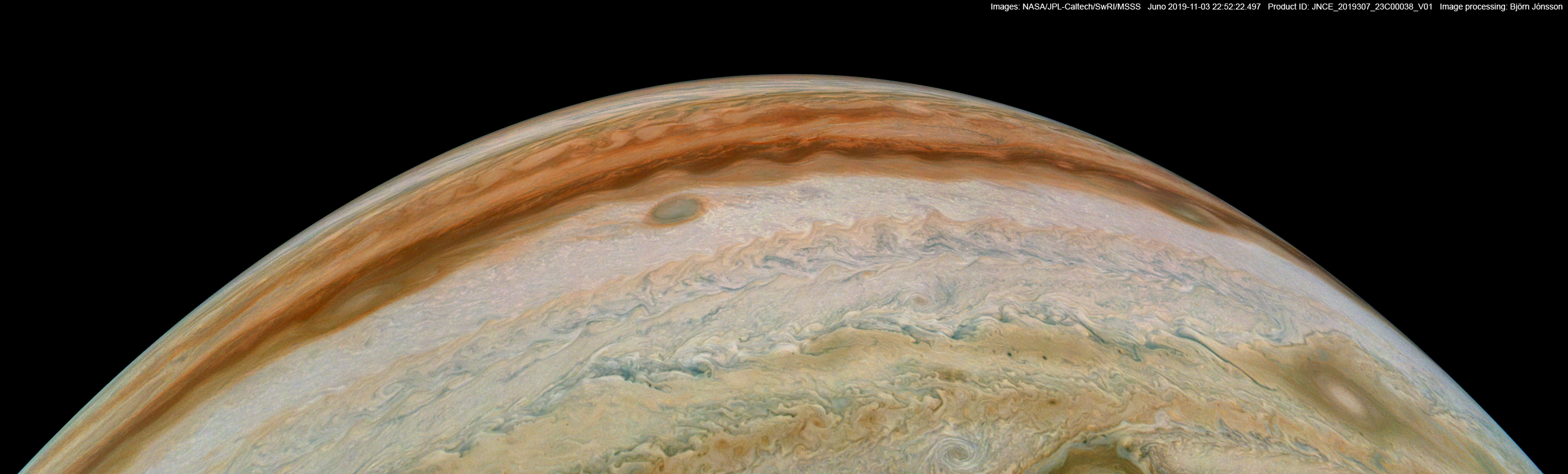 An image processed from the PJ23_38 raw image framelets. The contrast has been increased and color differences enhanced. This image has a very wide field of view; as a result Jupiter's shape appears a bit strange.