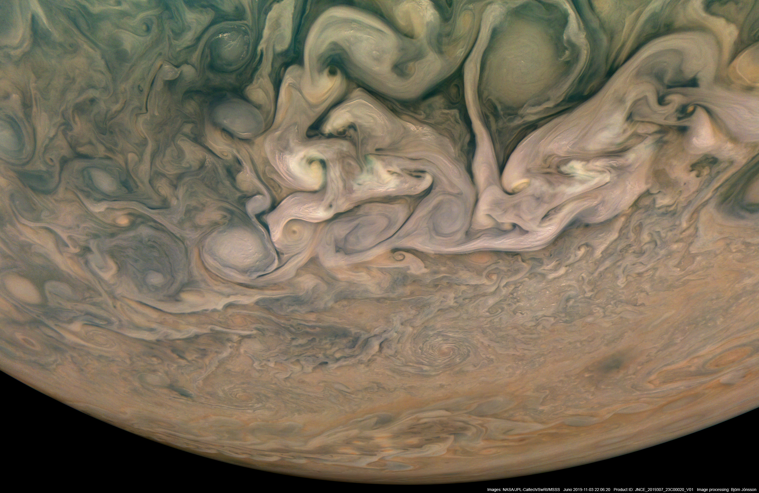 An image processed from the PJ23_20 raw image framelets. The contrast has been increased and color differences enhanced. The pastel colors above and slightly left of center are near planetographic latitude 52 degrees north. They are a real feature and not a processing artifact. These colors are also visible in the true color/contrast version of this image but look far more subdued there. The colors are also visible in versions of this image processed by others, in particular in Gerald Eichstädt's images. Hints of pastel colors have also been visible in some earlier JunoCam images (e.g. image PJ9_81) but they are especially strong in this image.
