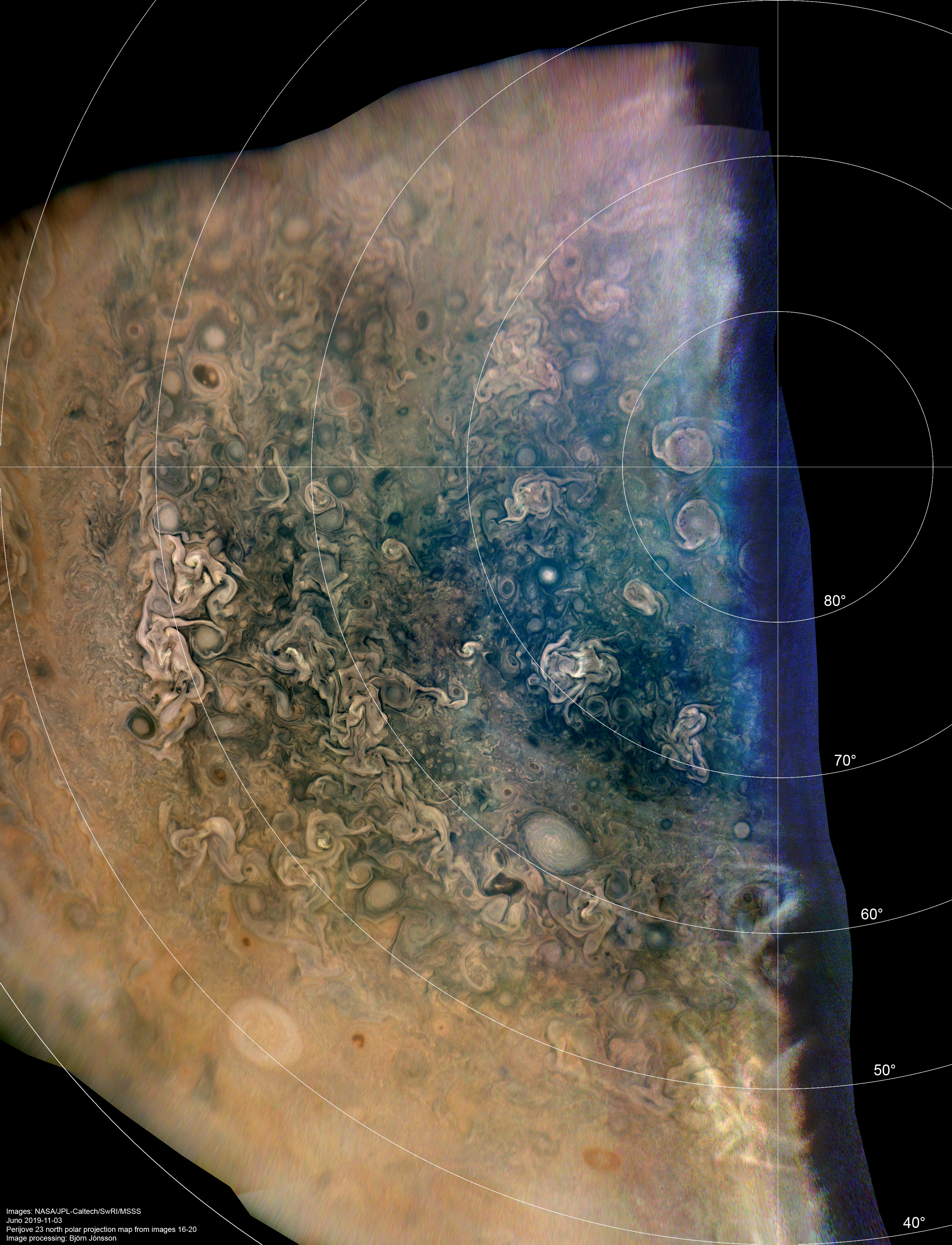 A north polar projection map mosaic from perijove 23 images 16 to 20. The map has been heavily processed to reveal various features that are not obvious in the true color/contrast version of this map. In particular the many haze bands in the north polar region are more obvious here. The large scale color and brightness variations in this image are probably relatively inaccurate, especially near the terminator and at upper right.