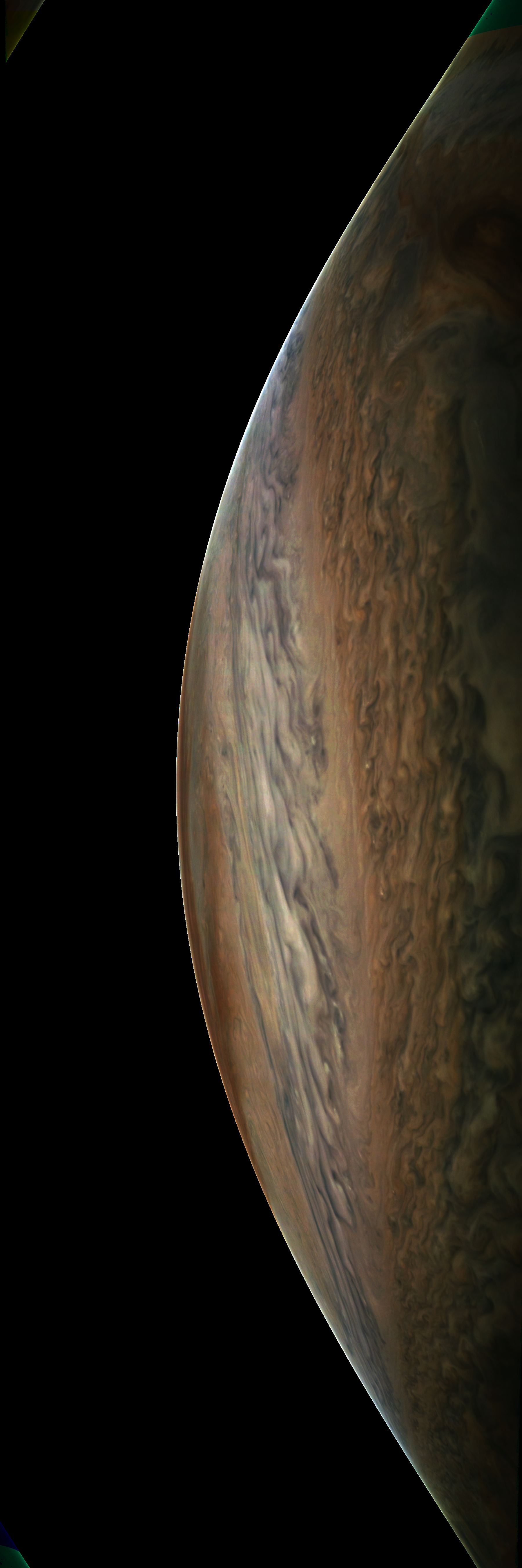 Resolution is 30 pixels per degrees in an equidistant cylindrical system centered to the camera at image stop time, with an axis parallel to Juno's spin axis. The rendered field of view is 60x180 degrees.