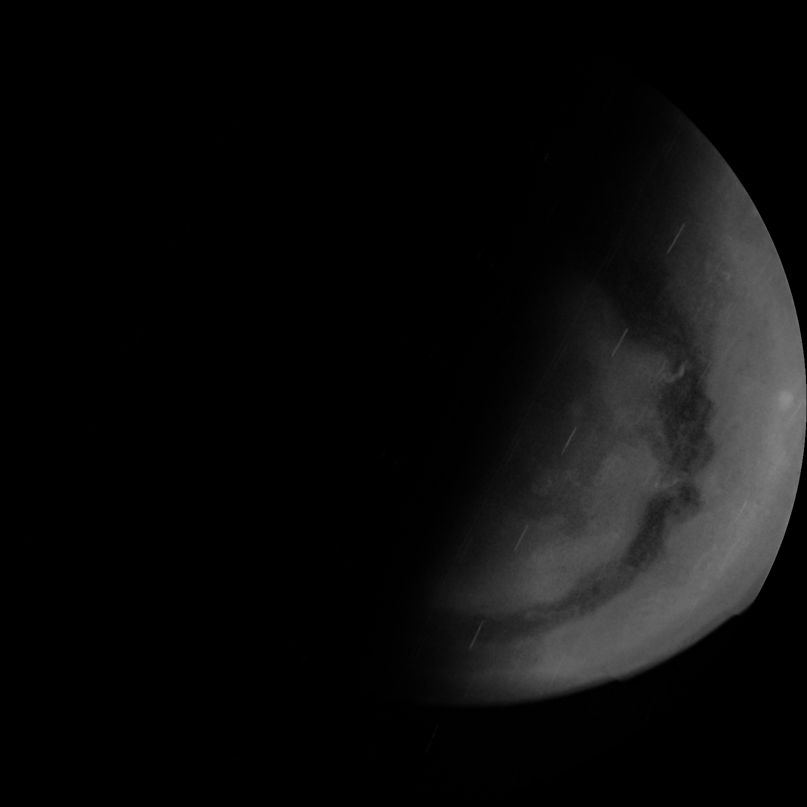 We have a methane filter, included for the polar science investigation, that is almost at the limits of our detector’s wavelength range. To get enough photons for an image we need to use a very long exposure. In some images this results in scattered light in the image. For science purposes we will simply crop out the portions of the image that include this artifact. Work is in progress to determine exactly what conditions cause stray light problems so that this can be minimized for future imaging.