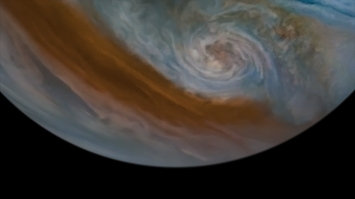 Processed using the JunoCam imager's PJ25 JET N1 raw images and data from NASA's Juno spacecraft flyby on February 17, 2020. Enhanced to highlight features, clouds, colours, and the beauty of Jupiter. Artist's impression - not representative of true colour.