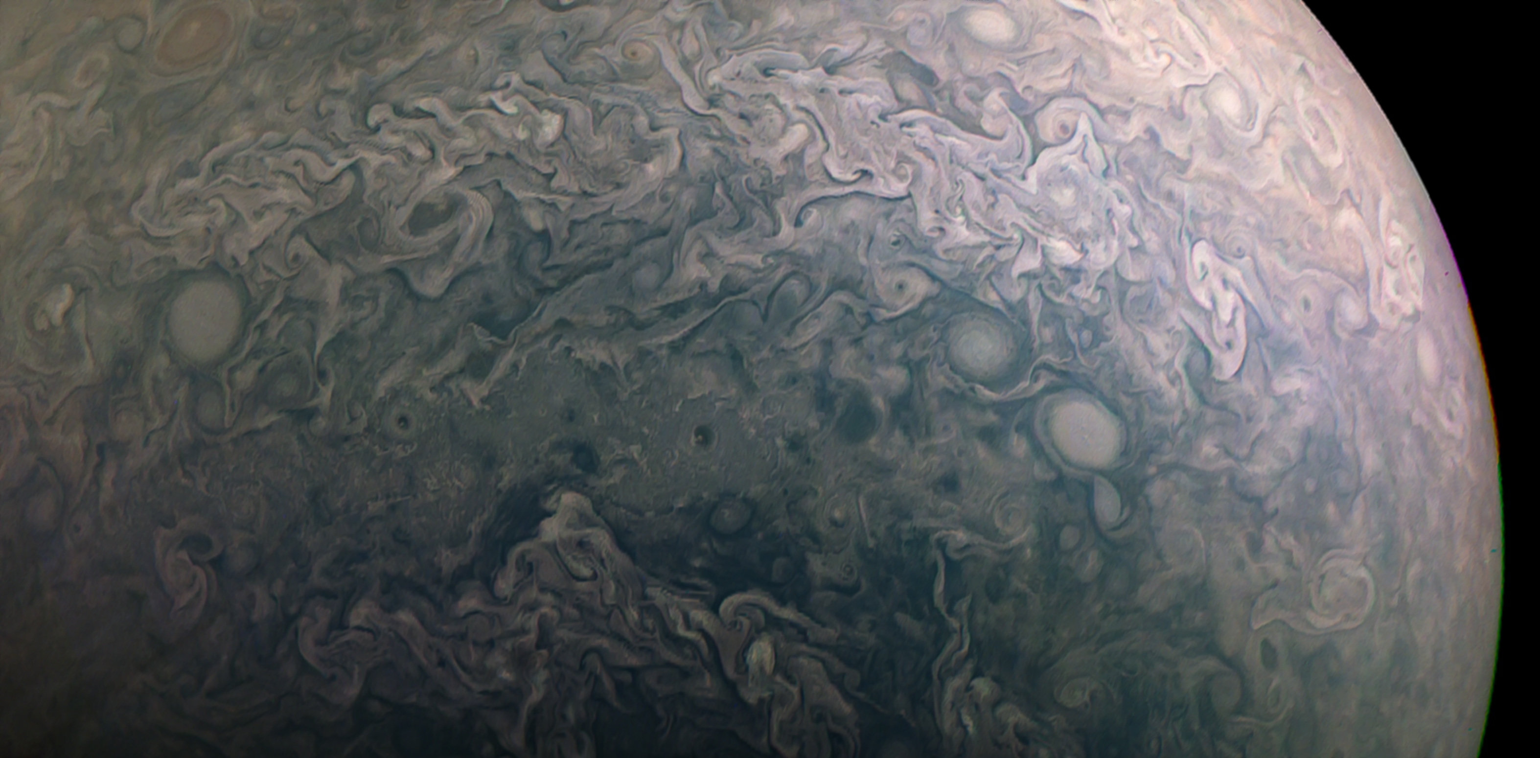 Junocam pixels are 12 bits deep from the camera but are converted to 8 bits inside the instrument using a lossless "companding" table, a process similar to gamma correction, to reduce their size. All Junocam products on the missionjuno website are in this 8-bit form as received on Earth. Scientific users interested in radiometric analysis should use the "RDR" data products archived with the Planetary Data System, which have been converted back to a linear 12-bit scale.