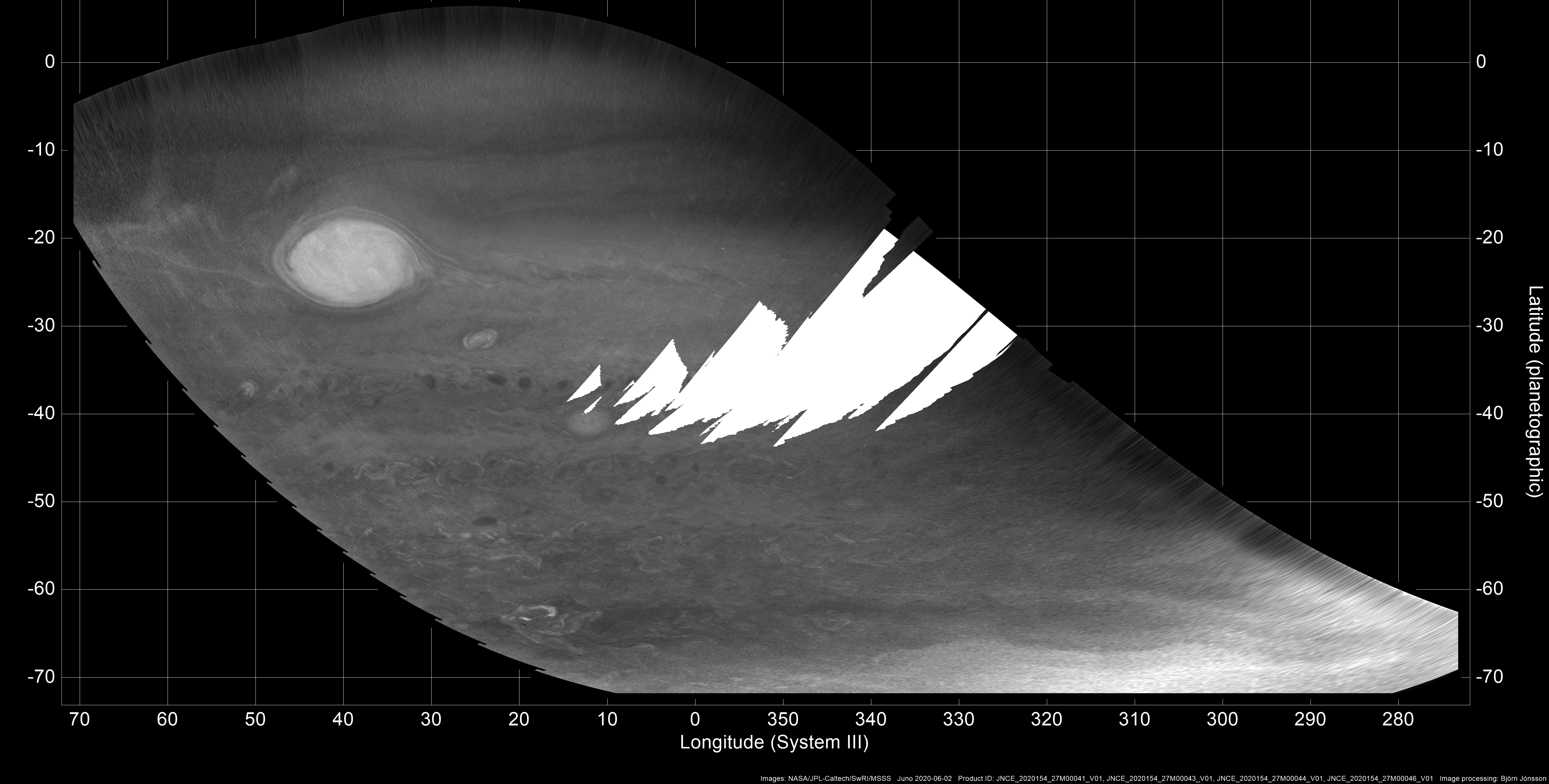 A map-projected mosaic of four images obtained using JunoCam's methane filter. The original images contain lots of noise and various artifacts. Here the most conspicuous artifacts have been removed. Despite this many artifacts remain, in particular many narrow, dark and bright lines. In the white areas no useful data was available. This mosaic has a resolution of 30 pixels/degree.