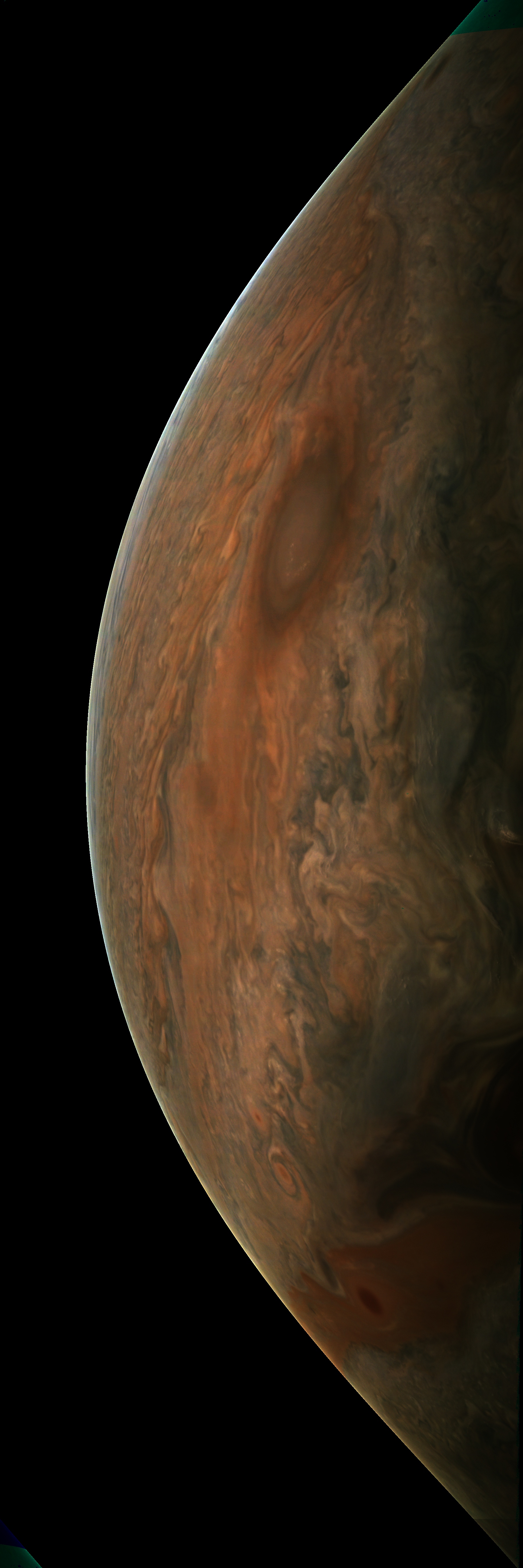 Resolution is 30 pixels per degrees in an equidistant cylindrical system centered to the camera at image stop time, with an axis parallel to Juno's spin axis. The rendered field of view is 60x180 degrees.